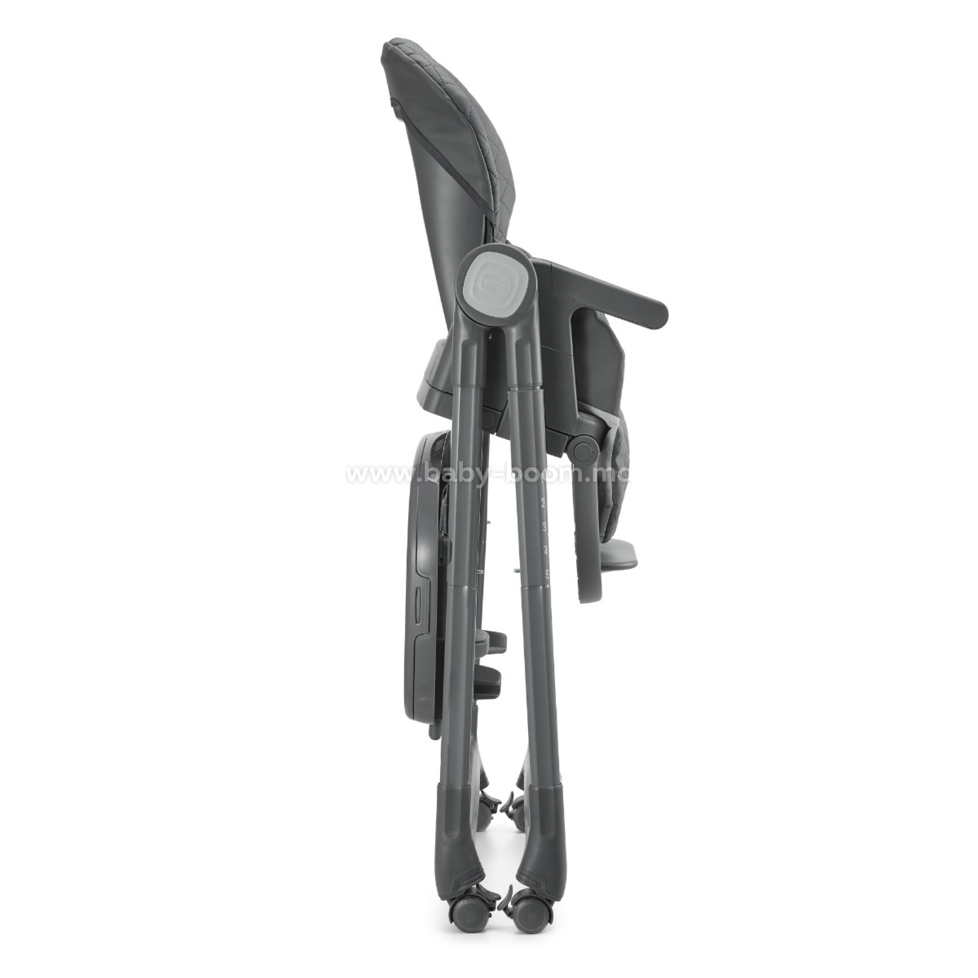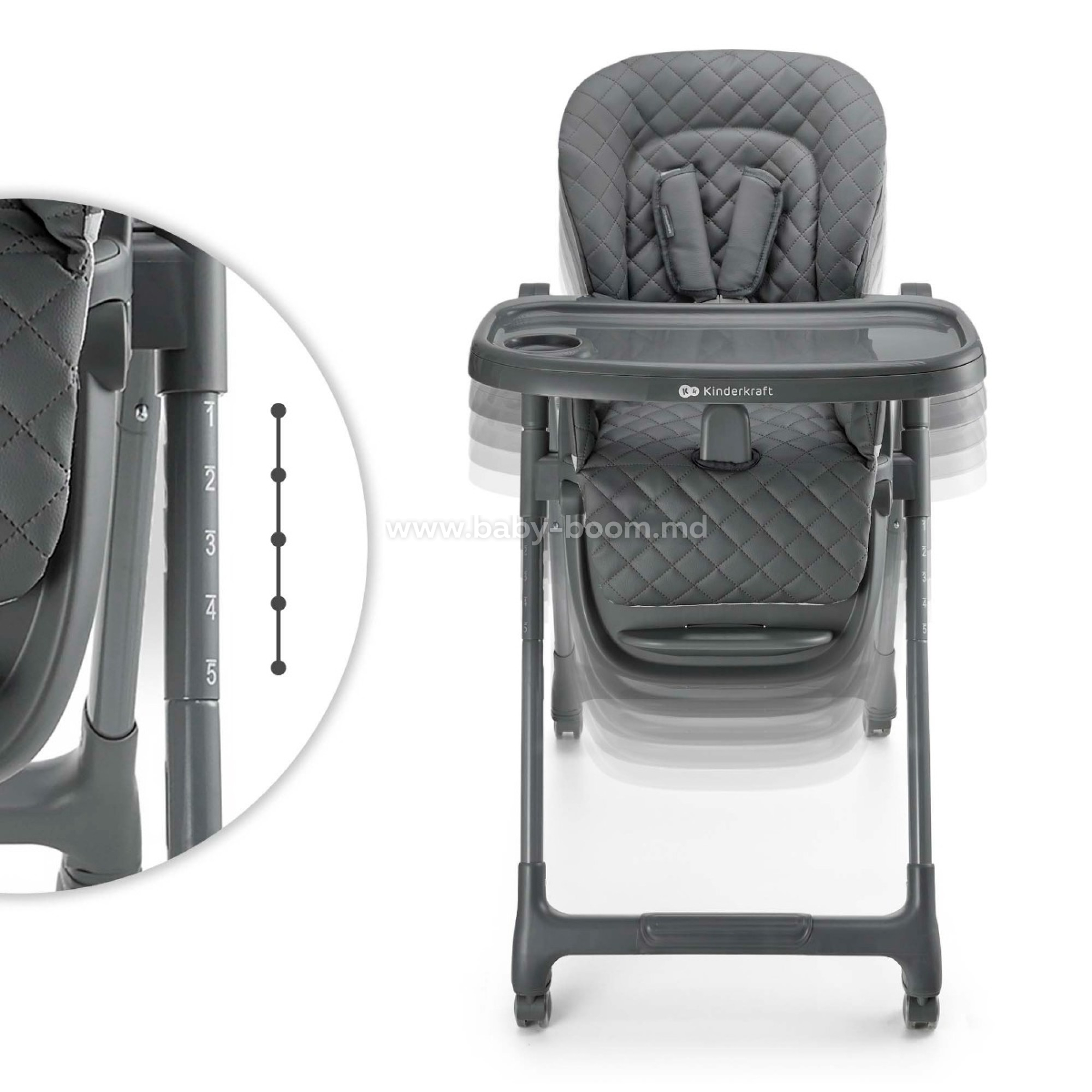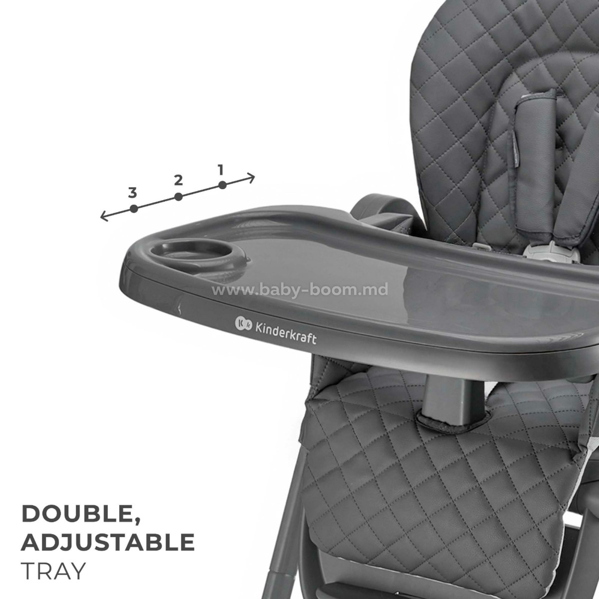 Scaunul are 5 reglaje de înălțime pentru a se potrivi perfect cu orice masă. Cu trei poziții de înclinare pentru spătar și suport pentru picioare, copilul dumneavoastră se va simți confortabil atât în ​​timpul hrănirii, cât și al odihnei. Tava dublă detașabilă, cu trei înălțimi reglabile, este ușor de curățat și poate fi depozitată pe cârlige speciale.