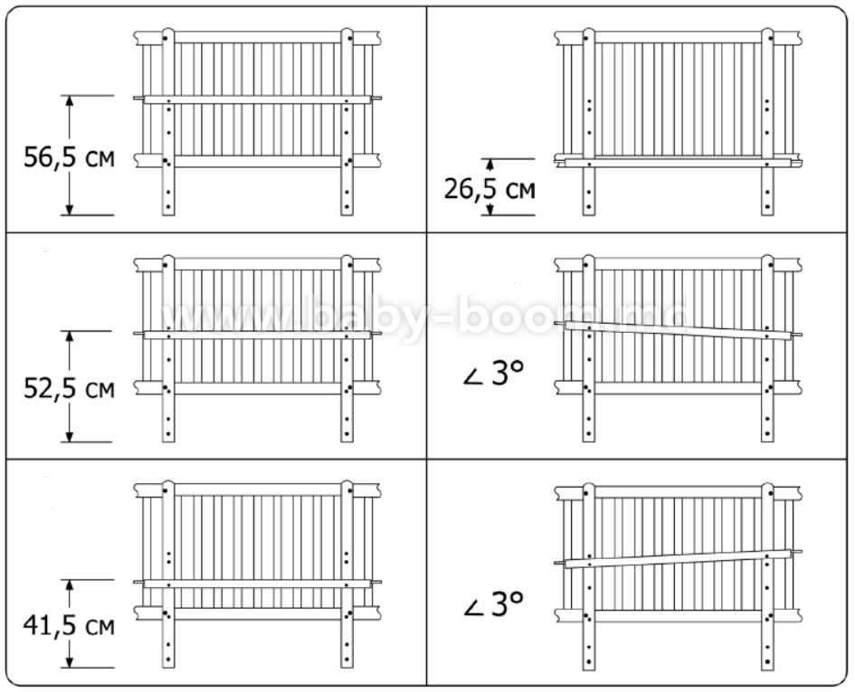- Opțiuni: saltea (80 x 60 cm), grilaje fixe (2 buc.), garnitură pentru saltea, elemente din pendul (2 buc), accesorii, instrucțiuni.