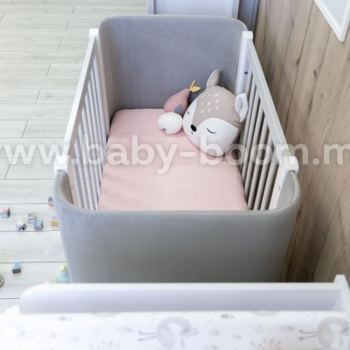 - Husele exterioare detașabile pentru pereții laterali ai pătuțului sunt din velur moale, asemănător tactil cu pielea de căprioară - confortabile și plăcute la atingere; materialul este hipoalergenic, rezistent la uzura, cu un grad ridicat de rezistenta la umiditate, compozitie - 100% PES; umplutură - spumă elastică; acoperire cu o cusătură largă, puternică, cu două linii; caracteristici de îngrijire: curățătorie chimică;