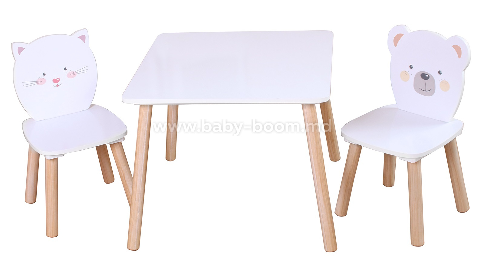 Acest set fermecător pentru copii este format dintr-o masă și două scaune cu spătare în formă de pisoi și ursuleț de pluș. Fabricat din MDF și lemn de înaltă calitate, cu finisaj natural, asigură stabilitate și siguranță în timpul jocului, desenului sau mesei. Marginile rotunjite și suprafața netedă asigură confort și siguranță maxime. Este completarea perfectă pentru orice cameră de copil sau zonă de joacă.