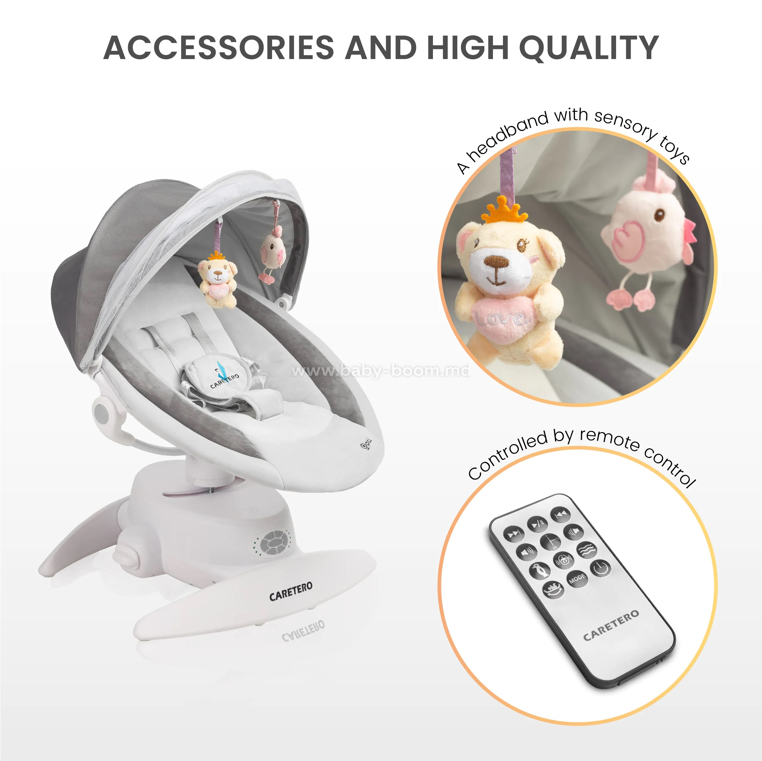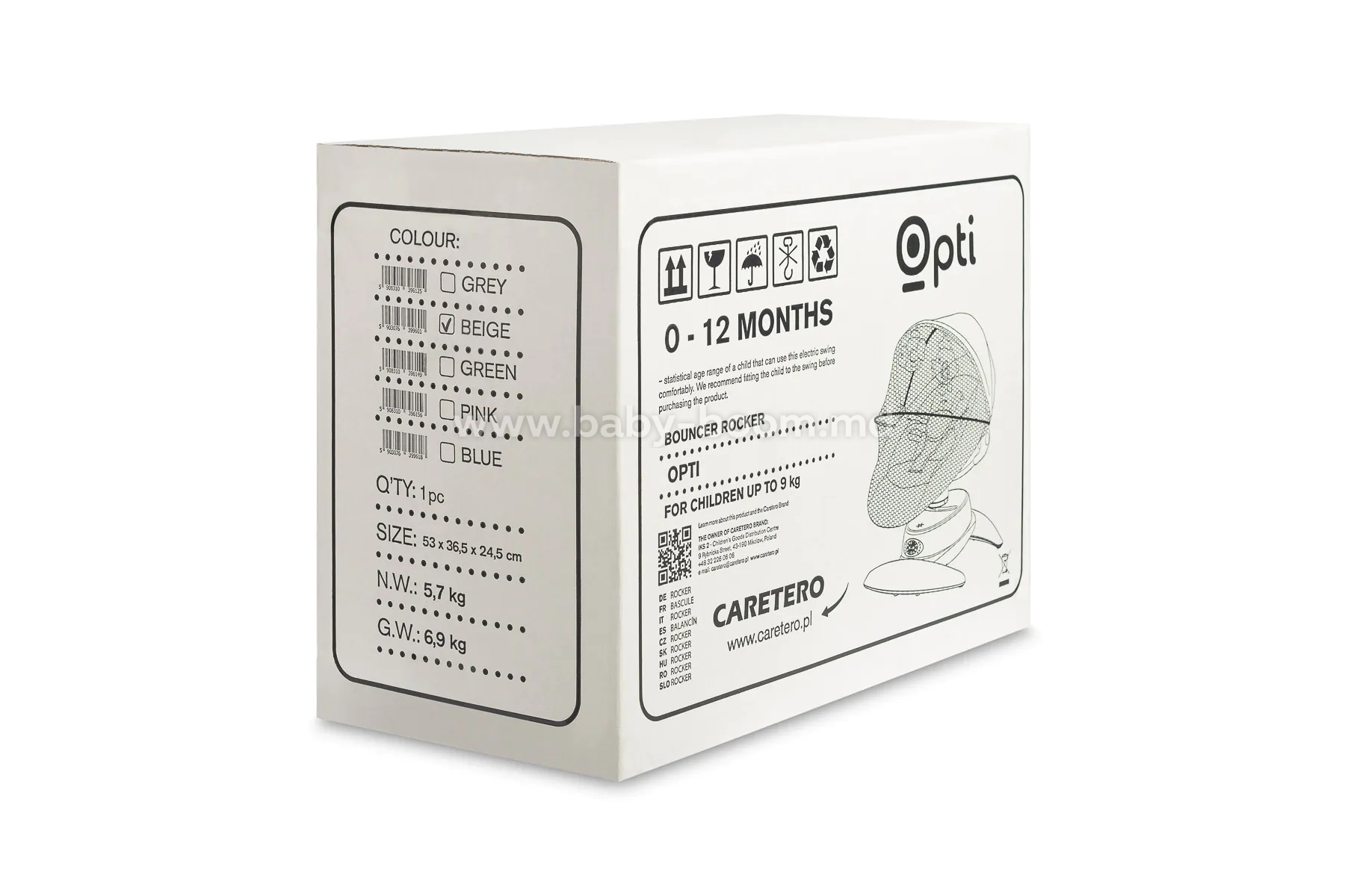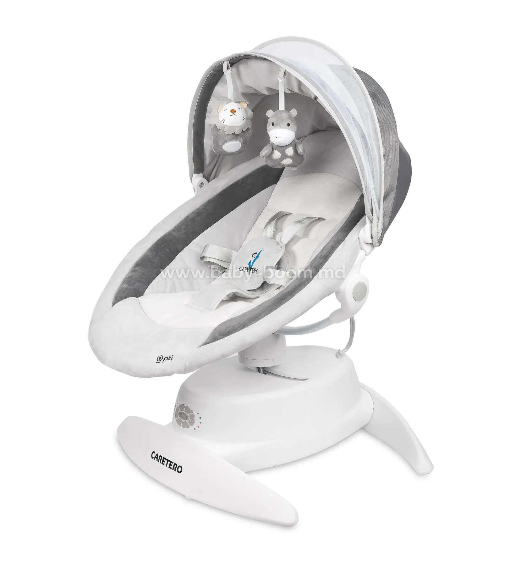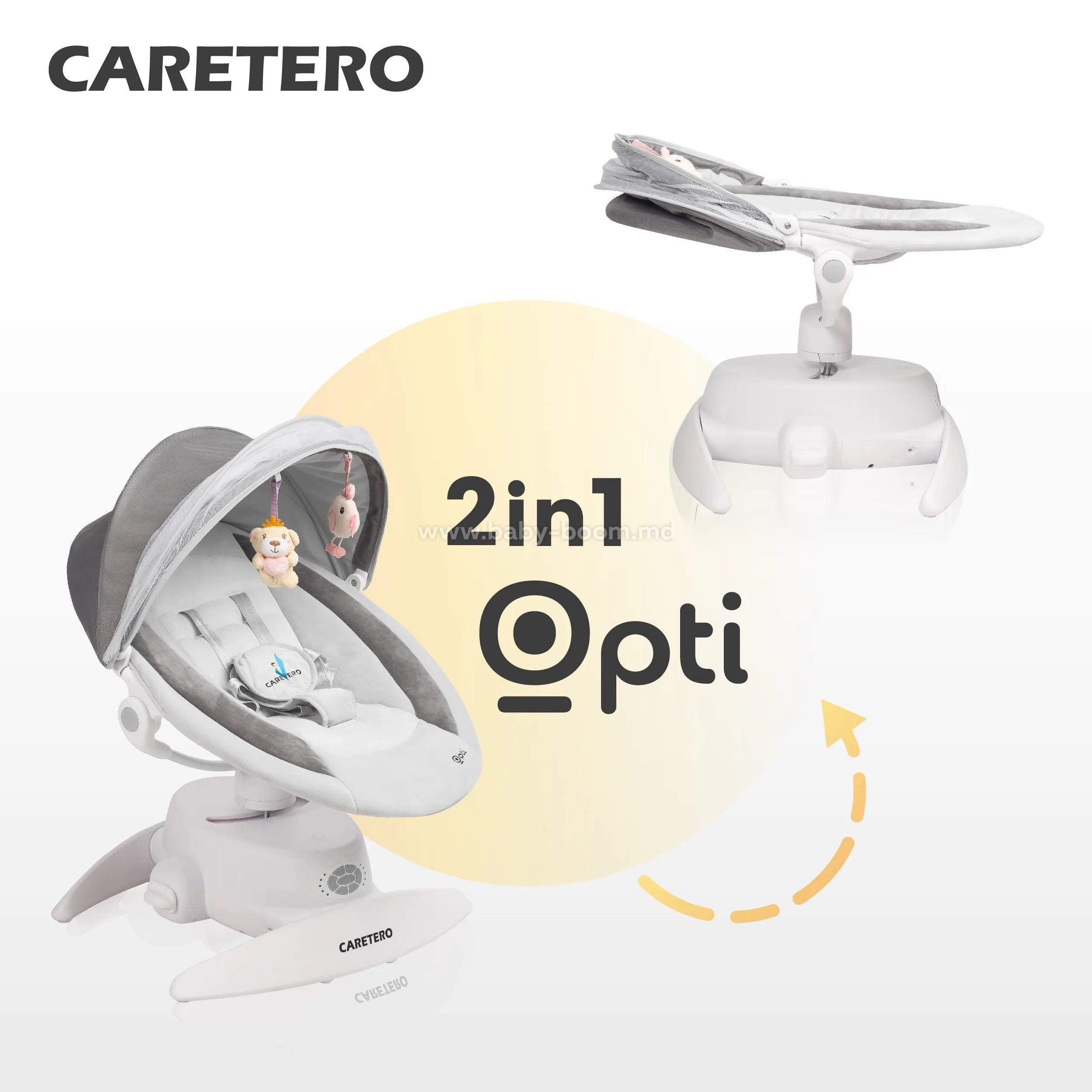 Opti este un balansoar revoluționar pentru bebeluși, care oferă un confort excepțional bebelușului. Ținând cont de nevoile și siguranța bebelușului, marca Caretero prezintă un dispozitiv modern care oferă trei moduri de funcționare și posibilitatea de a controla complet poziția scaunului pentru relaxare și plăcere maximă. Balansoarul poate fi controlat de la distanță folosind telecomanda.
