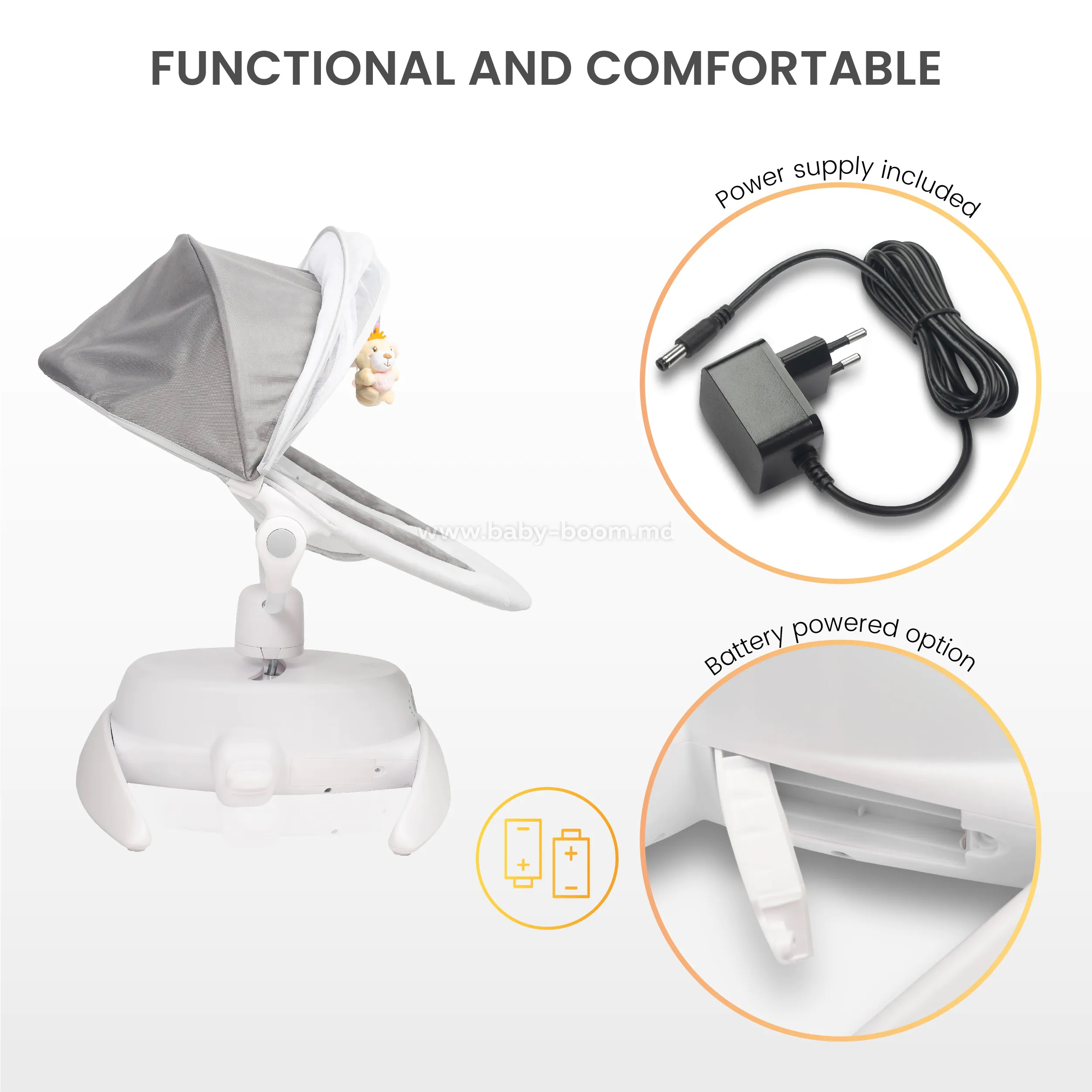 - Înclinare reglabilă a balansoarului - datorită celor trei unghiuri diferite de înclinare a balansoarului, părinții pot ajusta poziția în funcție de preferințele și nevoile bebelușului, asigurând confort maxim în timpul somnului sau al jocului;