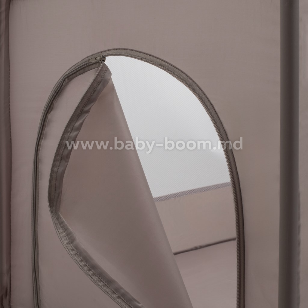Datorită mecanismului său simplu și intuitiv de pliere, pătuțul poate fi pliat rapid la o dimensiune compactă, plasat în geanta inclusă și transportat ușor cu mașina. Cadrul ușor, echipat cu roți și o frână încorporată, facilitează mutarea între camere și pe un balcon sau o terasă.