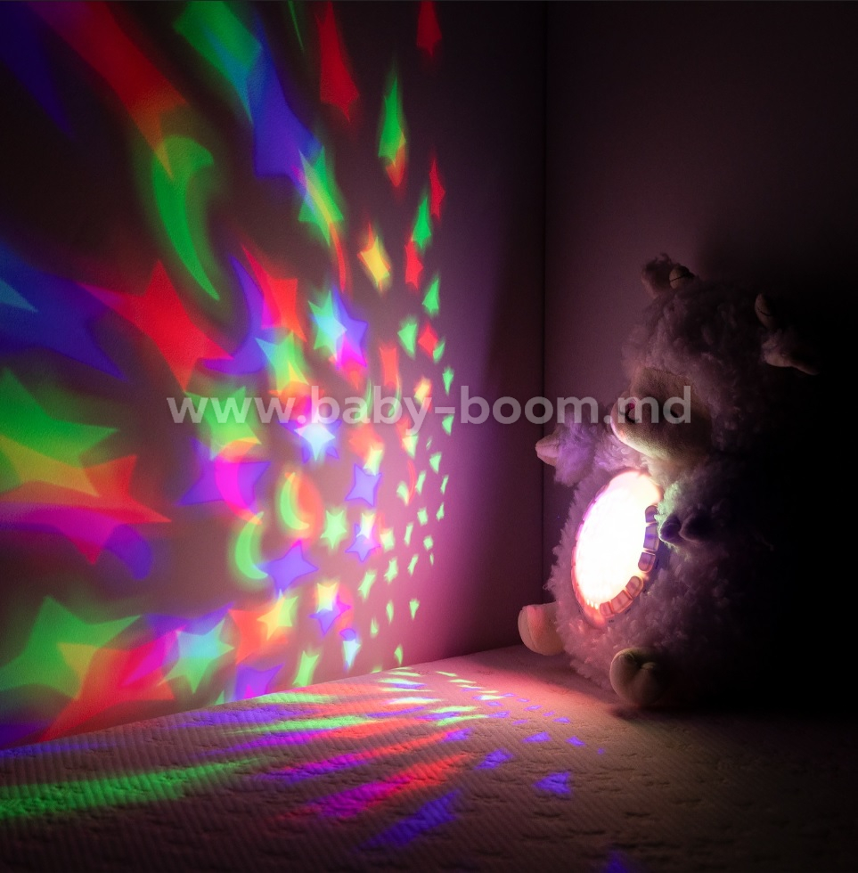 Un mielușel de pluș moale și confortabil, care va aduce pace și bucurie copilului dumneavoastră. Dispune de o cutie muzicală încorporată cu 10 melodii liniștitoare, inclusiv cântece de leagăn și sunete ale naturii (valuri, păsări și bătăi ale inimii). Proiectorul LED încorporat transformă camera într-un spațiu magic, cu o iluminare blândă și colorată.
