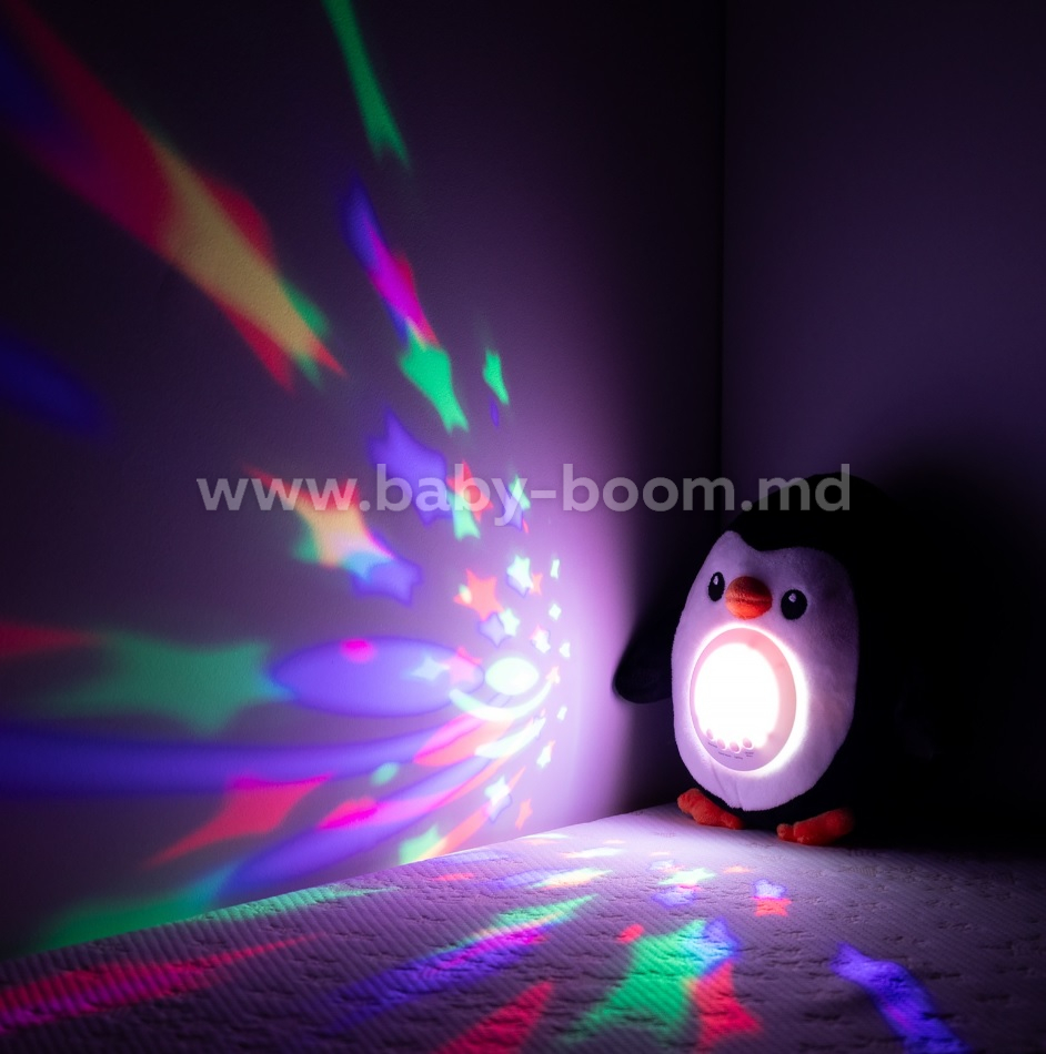 • Apăsarea unui buton activează un proiector LED colorat care își schimbă treptat culoarea, liniștind bebelușul.