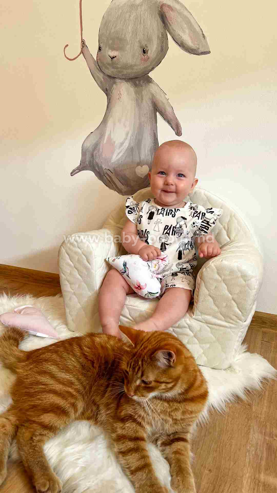 Salopetă de vară din bumbac New Baby Paris cu mâneci scurte cu volan. Salopeta are imprimeu cu motiv Paris și mâneci drăguțe cu volane. Are o inchidere practica cu nasture pe umar si intre picioare, ceea ce faciliteaza imbracarea si schimbarea scutecelor. Tematica de vară drăguță va decora toate fetițele.