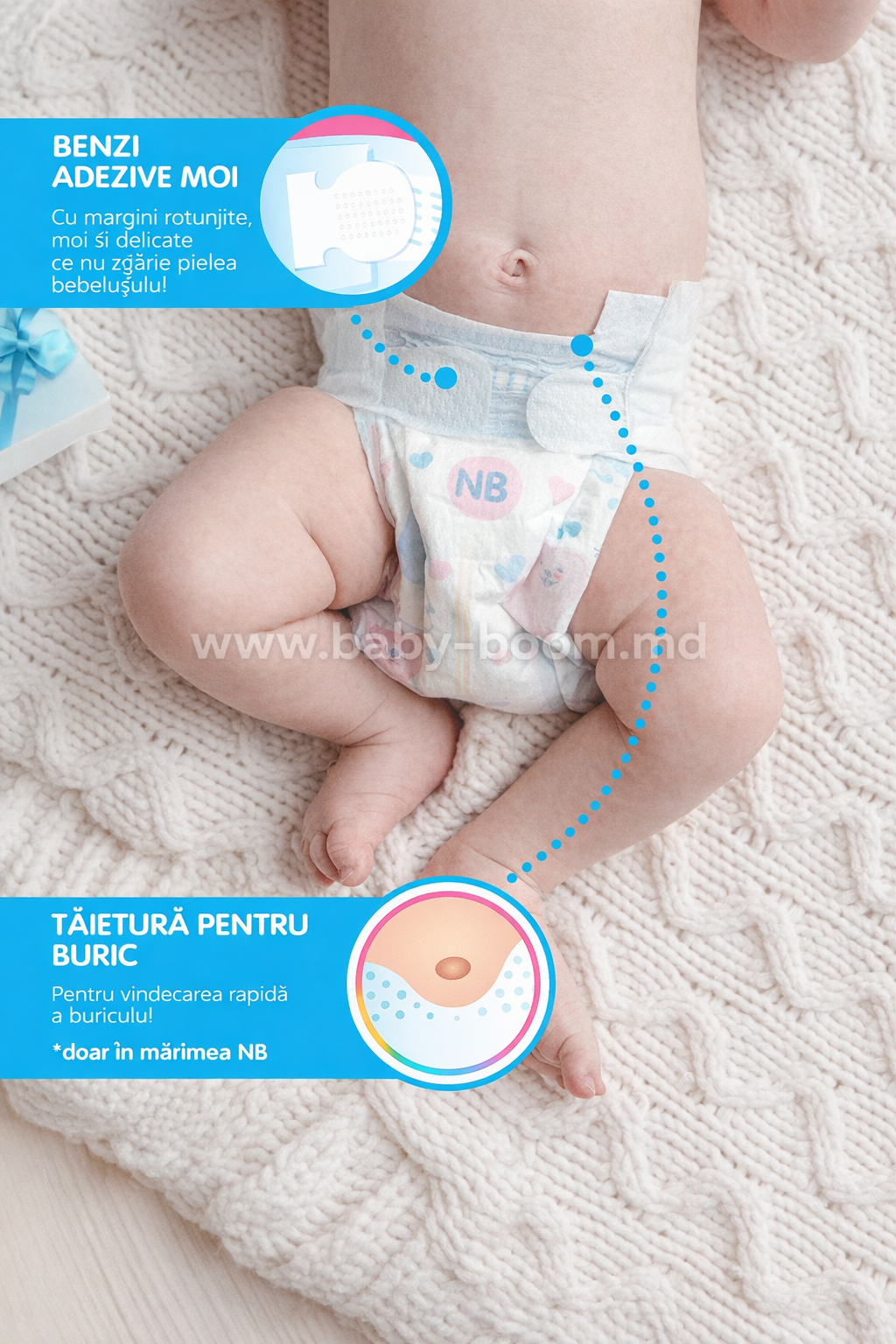 - Velcro moale. Velcro poate fi prins de mai multe ori. Marginile rotunjite nu zgarie pielea bebelusului.