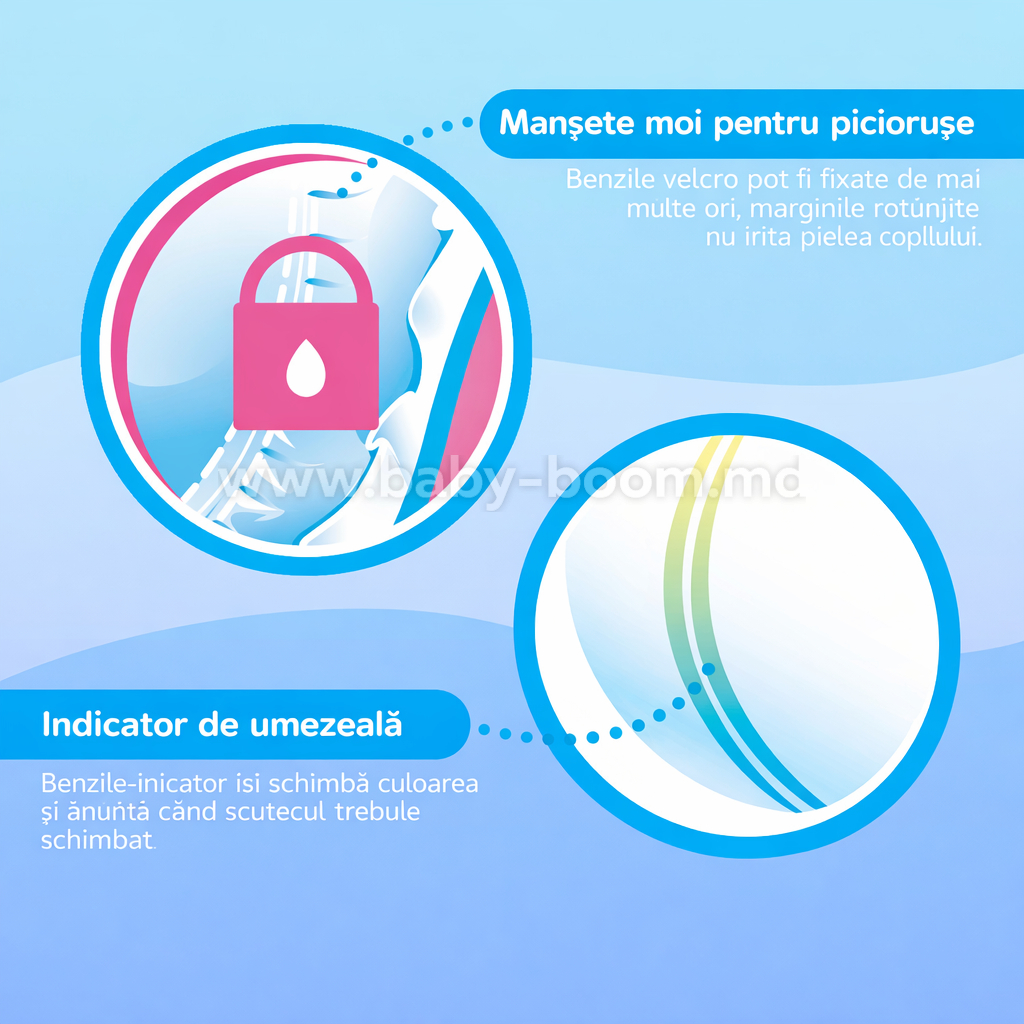 - Indicator de umiditate. Benzile indicatoare își vor schimba culoarea și vă vor spune când este timpul să schimbați scutecul.