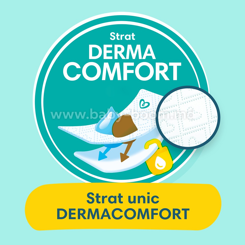 - Stratul Dry Max accelerează distribuţia lichidului în interiorul miezului absorbant transformîndu-l în gel, astfel umezeala nu intră în contact cu pielea bebelușului, ce rămâne mereu uscată şi sănătoasă;