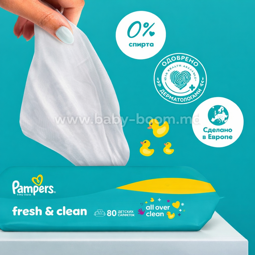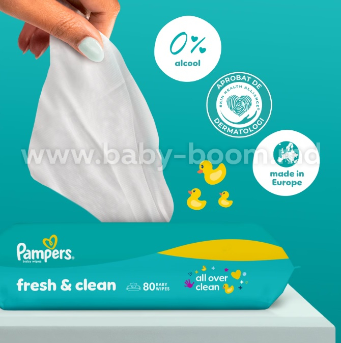 Curățenie și prospețime, exact ca după băiță! Șervețelele Pampers Fresh Clean combină textura moale Soft Grip cu un parfum revigorant, asigurând o curățare delicată și eficientă a pielii fine a bebelușului dumneavoastră. Sunt ideale pentru utilizarea la schimbarea scutecului, precum și pentru ștergerea mâinilor sau a feței.