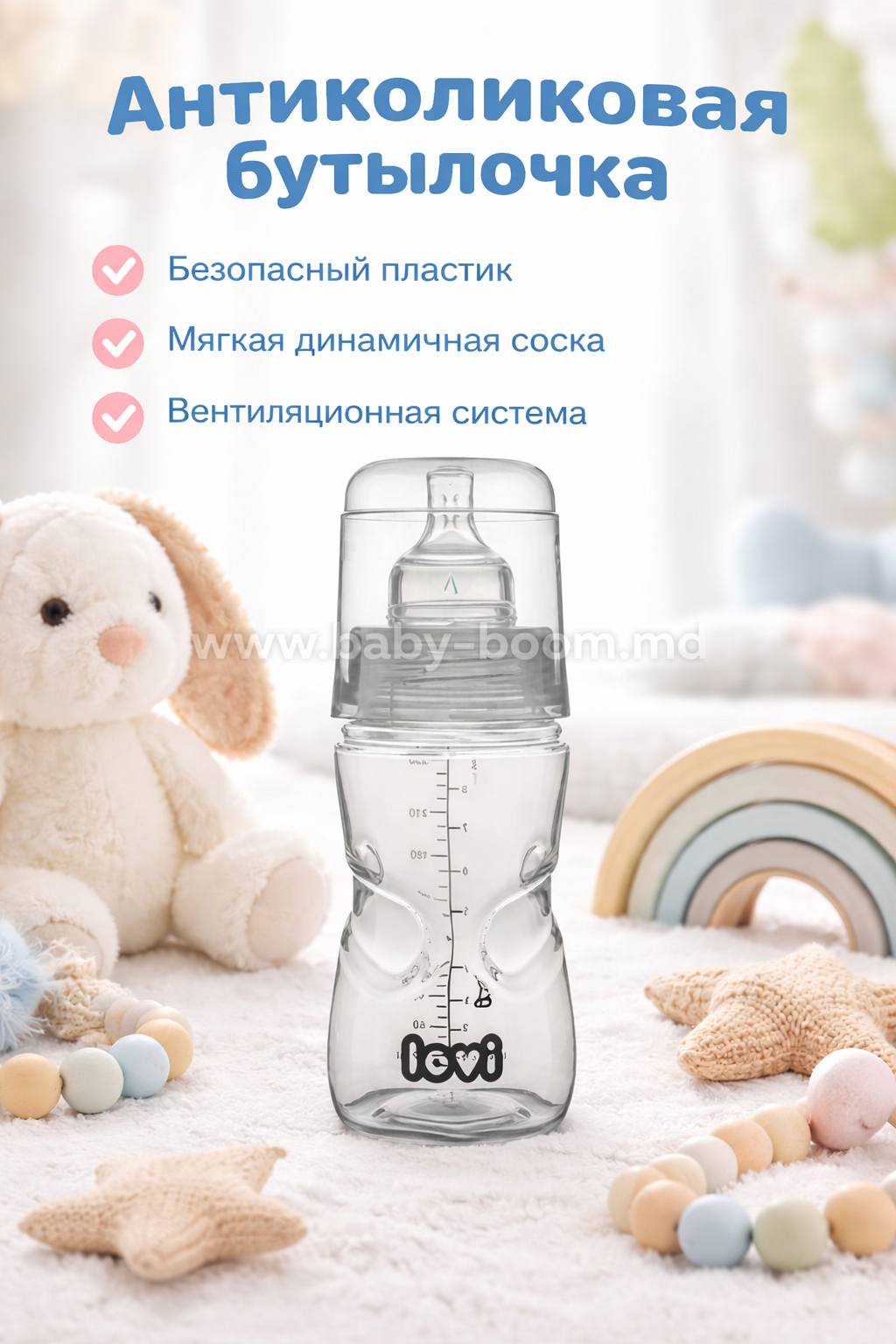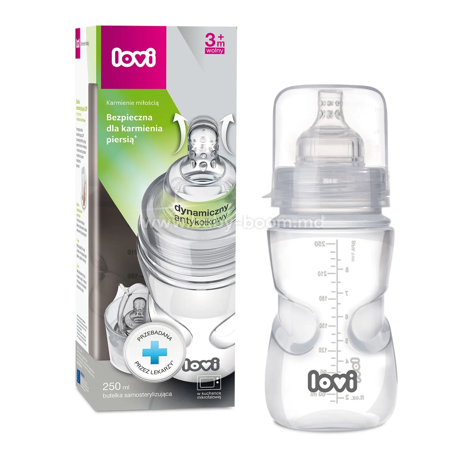 Grija pentru copil începe cu confortul lui. Biberonul LOVI este creat pentru o hrănire cât mai naturală și liniștită, atât pentru bebeluș, cât și pentru părinți. Tetina dinamică respectă ritmul natural de supt, iar sistemul anticolici ajută la reducerea disconfortului și a aerului înghițit.