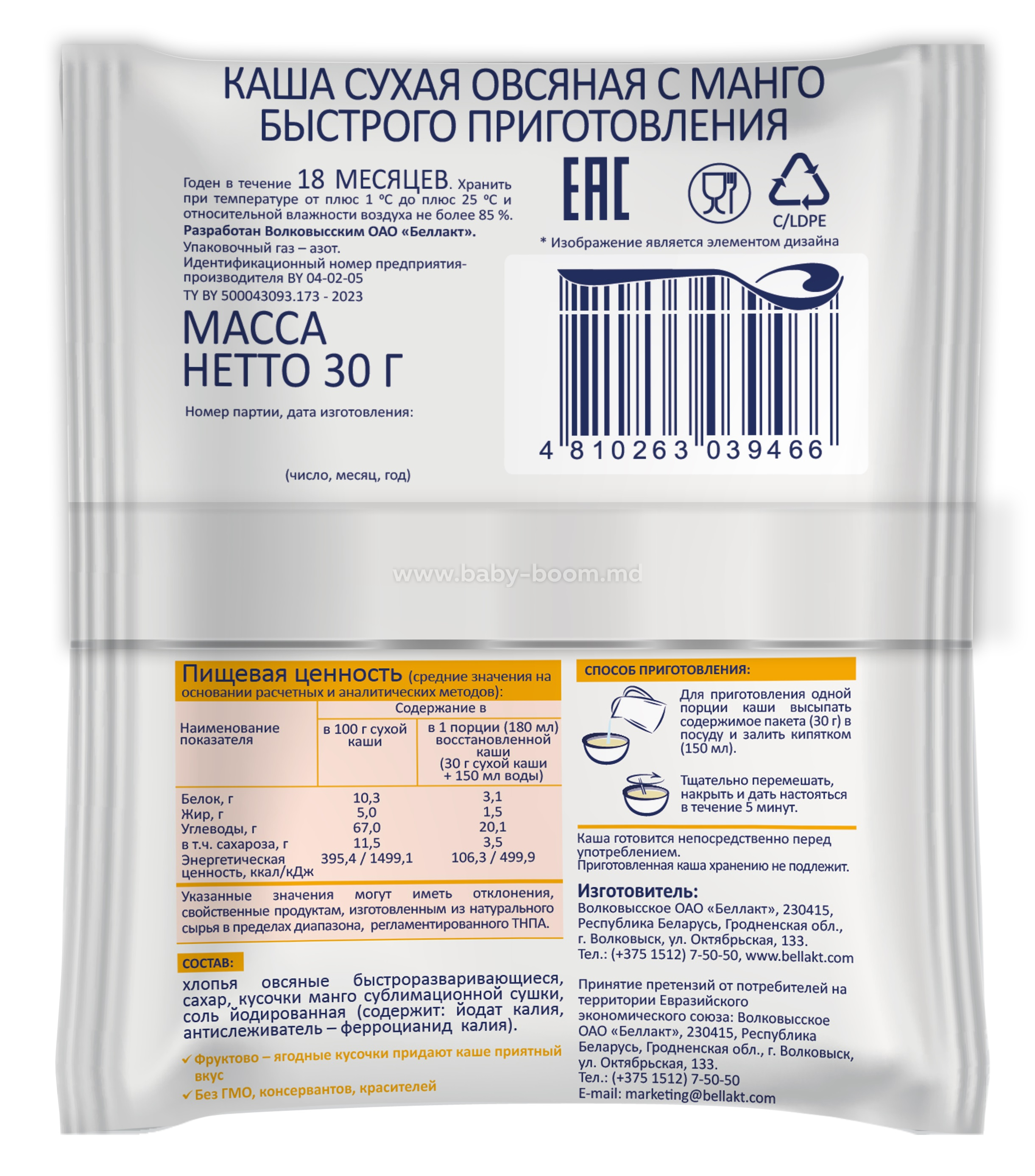 Беллакт Terci de ovăz cu mango "Micul dejun sănătos" (30 g)