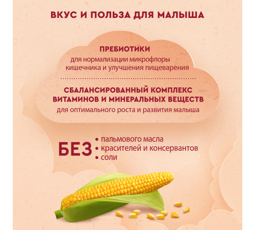 Porumbul de porumb este bogat în vitamine din grupa B, E, A, PP. O proprietate unică a porumbului este reducerea proceselor de fermentare în intestine. Terci din porumb cu lapte cu prebiotice diversifică meniul bebelușului de peste 5 luni și oferă impresii noi de gust.