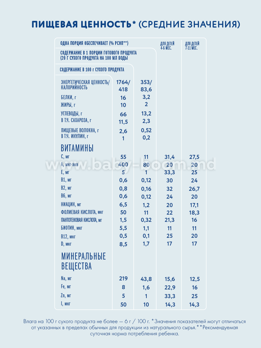 Metoda de preparare: Se toarnă 80 ml de apă fiartă, apoi se răcește la 40-50 ° C; adăugați treptat în apă 20 g (4-5 linguri fără vârf) terci uscat; se amestecă bine până se răcește și se răcește până la o temperatură confortabilă pentru hrănirea copilului. Începeți să introduceți terciul în alimentație treptat cu 1 lingură de produs finit. După ce gătiți terci, închideți cu grijă pachetul. Se recomandă să gătești terciuri imediat înainte de fiecare masă. Nu reîncălziți în cuptorul cu microunde.