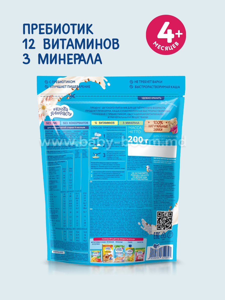 "Когда Я Вырасту" Terci de hrișcă - este un produs alimentar echilibrat și sănătos pentru copii. Terciul este îmbogățit cu prebiotic, pentru a îmbunătăți digestia, precum și vitamine și minerale, atât de necesare pentru copil la această vârstă. Terci sunt produse la cea mai nouă plantă modernă, în conformitate cu cerințele ridicate pentru calitatea alimentelor pentru copii.