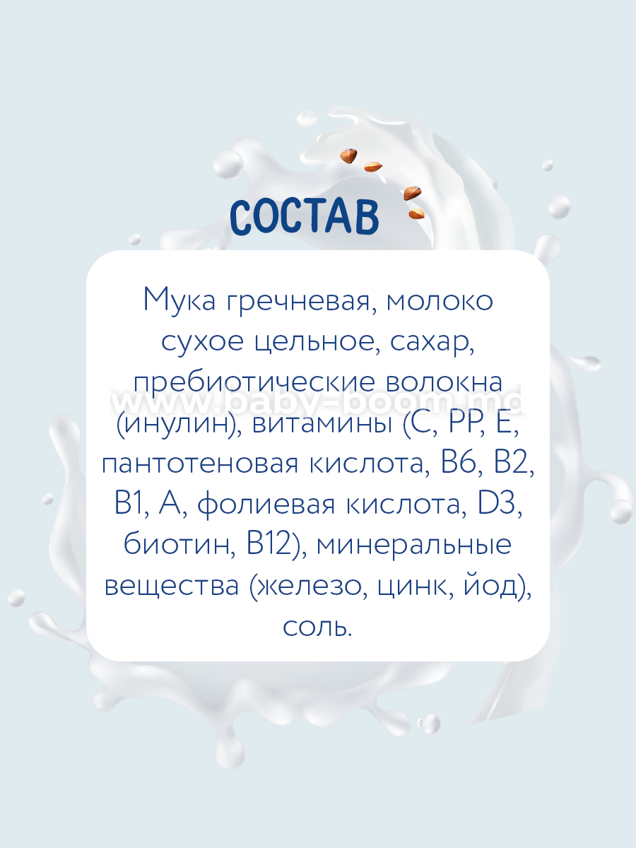 Ingrediente: făină de hrișcă, lapte praf, zahăr pudră, prebiotic, inulină, sare, premix vitamino-mineral (C (L-acid ascorbic) de fier (II) fumarat, E (DL-alfa tocoferil acetat), niacină (nicotinamida) oxid de zinc, acid pantotenic (D-pantotenat de calciu), B6 (riboflavină), B1 (mononitrat de tiamină), A (acetat de retinol), acid folic, iodură de potasiu, D3 cholecalciferol, -biotină), K (ficlochinonă), B12 (ciancobalamină)).