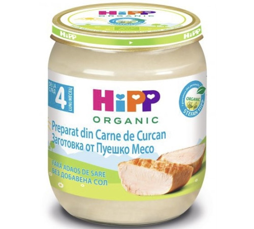 Hipp Organic Meat este un piure organic de curcan pentru bebeluși destinat bebelușilor cu vârsta peste 4 luni. Produsul completează hrana pentru bebeluși din lapte și oferă copilului vitamine esențiale, contribuind astfel la formarea mecanismelor naturale de apărare ale organismului. Piureul nu conține arome artificiale, conservanți, coloranți sau agenți de îngroșare. Produsul pentru bebeluși are o consistență netedă. Piureul este realizat din produse 100% organice. Toate piureurile HiPP sunt produse fără stimulente de creștere și respectă toate cerințele legale privind coloranții și conservanții.