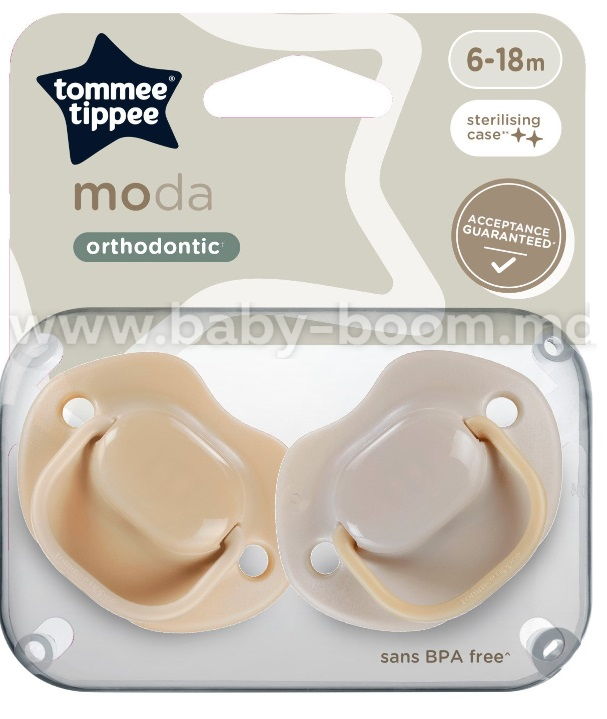 Suzeta ortodontică Tommee Tippee Moda promovează dezvoltarea corectă a mușcăturii copilului. Forma simetrică a produsului este perfect percepută de bebeluși. Acest fapt este confirmat de teste independente efectuate în Marea Britanie. Conform studiului, 82% dintre bebeluși au acceptat acest model de suzetă după prima utilizare. Misterul suzetei Tommee Tippee Moda constă în faptul că forma suzetei este cât mai asemănătoare cu forma tetinei unui biberon. De aceea se obișnuiesc copiii atât de ușor.