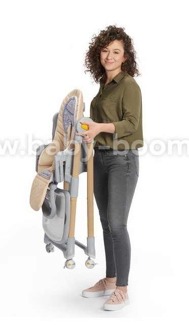 - Scaunul înalt poate fi pliat cu ușurință și plasat în colțul bucătăriei sau al mesei. Pentru a-i reduce dimensiunea, puteți scoate tava complet și o puteți atașa la picioare - scaunul va ocupa și mai puțin spațiu.