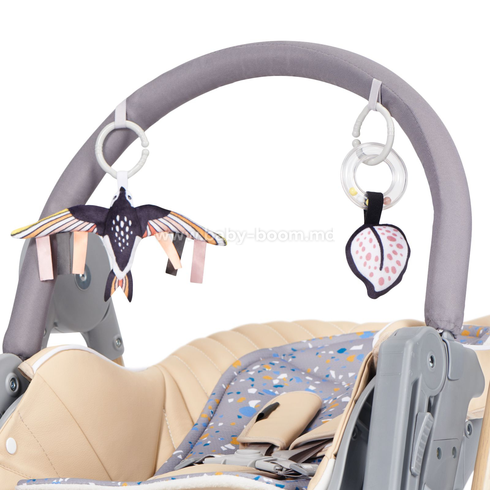 - Setul include un arc cu 2 jucării care îl vor interesa pe copil și îl vor motiva să tragă brațele în sus. Jucăriile cu diferite texturi stimulează dezvoltarea atingerii, oferind în același timp copilului o mulțime de plăcere.
