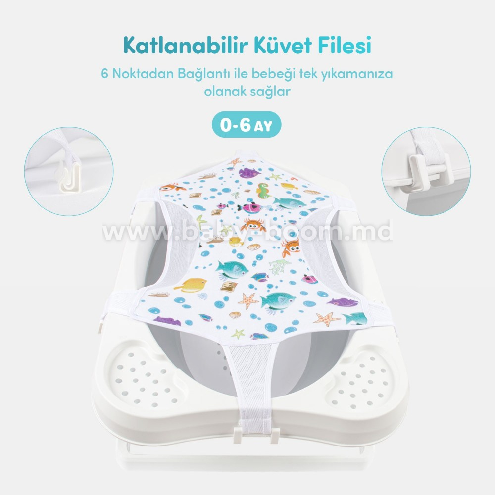 Plasa de baie pliabilă cu textura moale vă permite să vă spălați singur copilul datorită atașării în 6 puncte la cadă. Poate fi folosit de la nastere pana la 6 luni. Se poate spala la masina sau manual la 30 de grade.