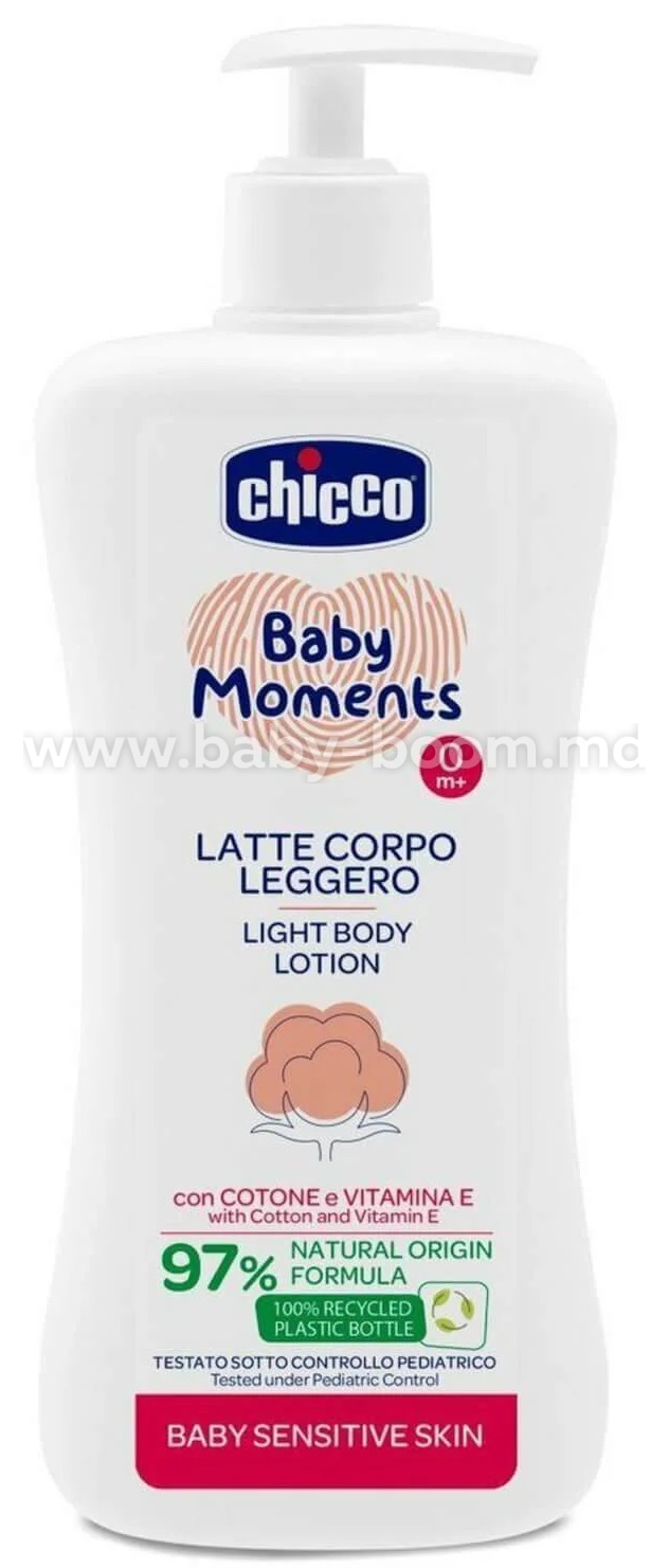 Loțiunea de corp Chicco Baby Moments pentru piele sensibilă hidratează pielea sensibilă a bebelușului, lăsând-o netedă și catifelată.