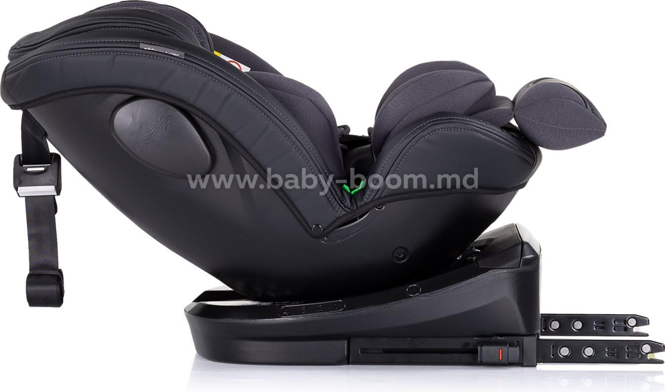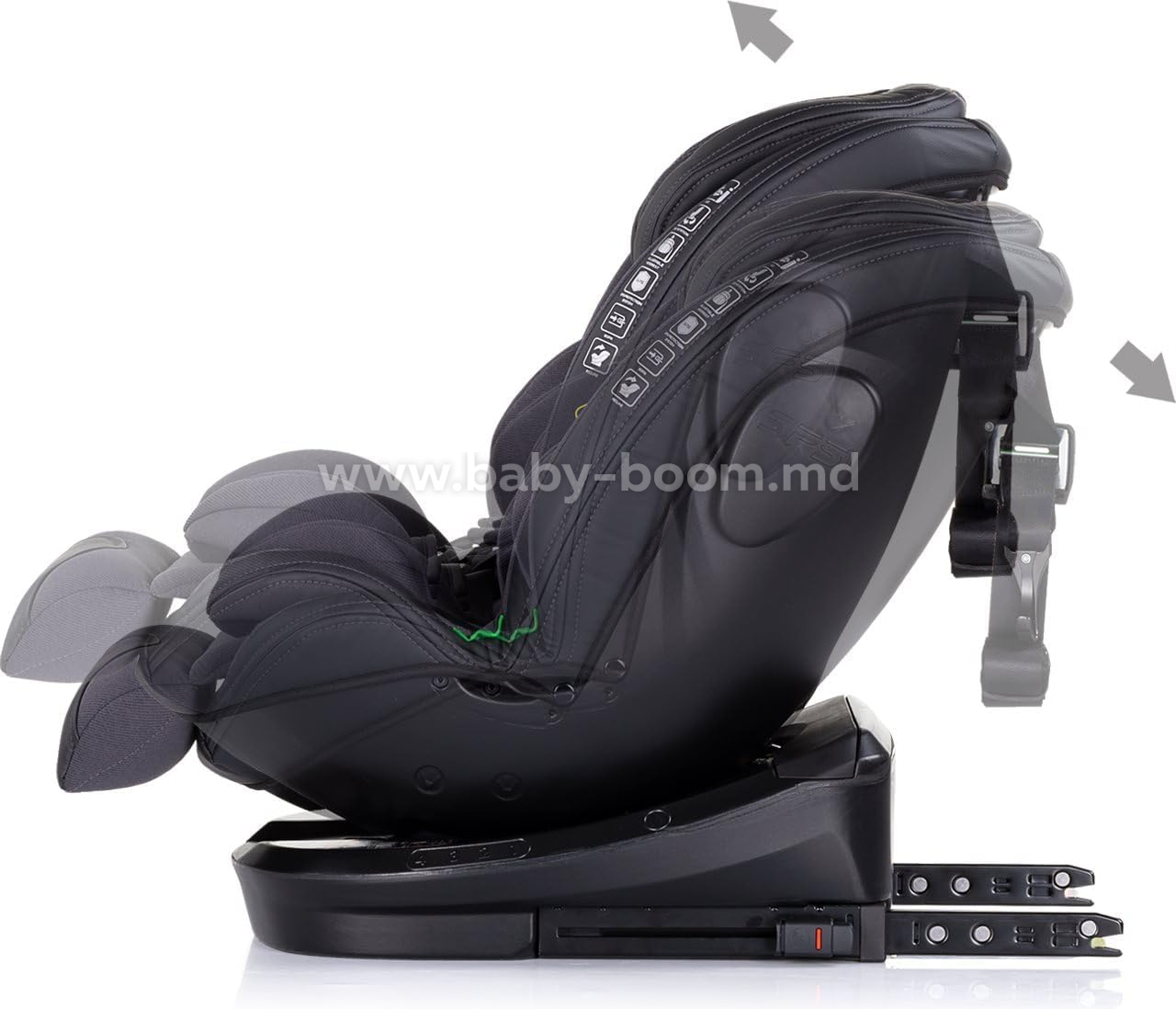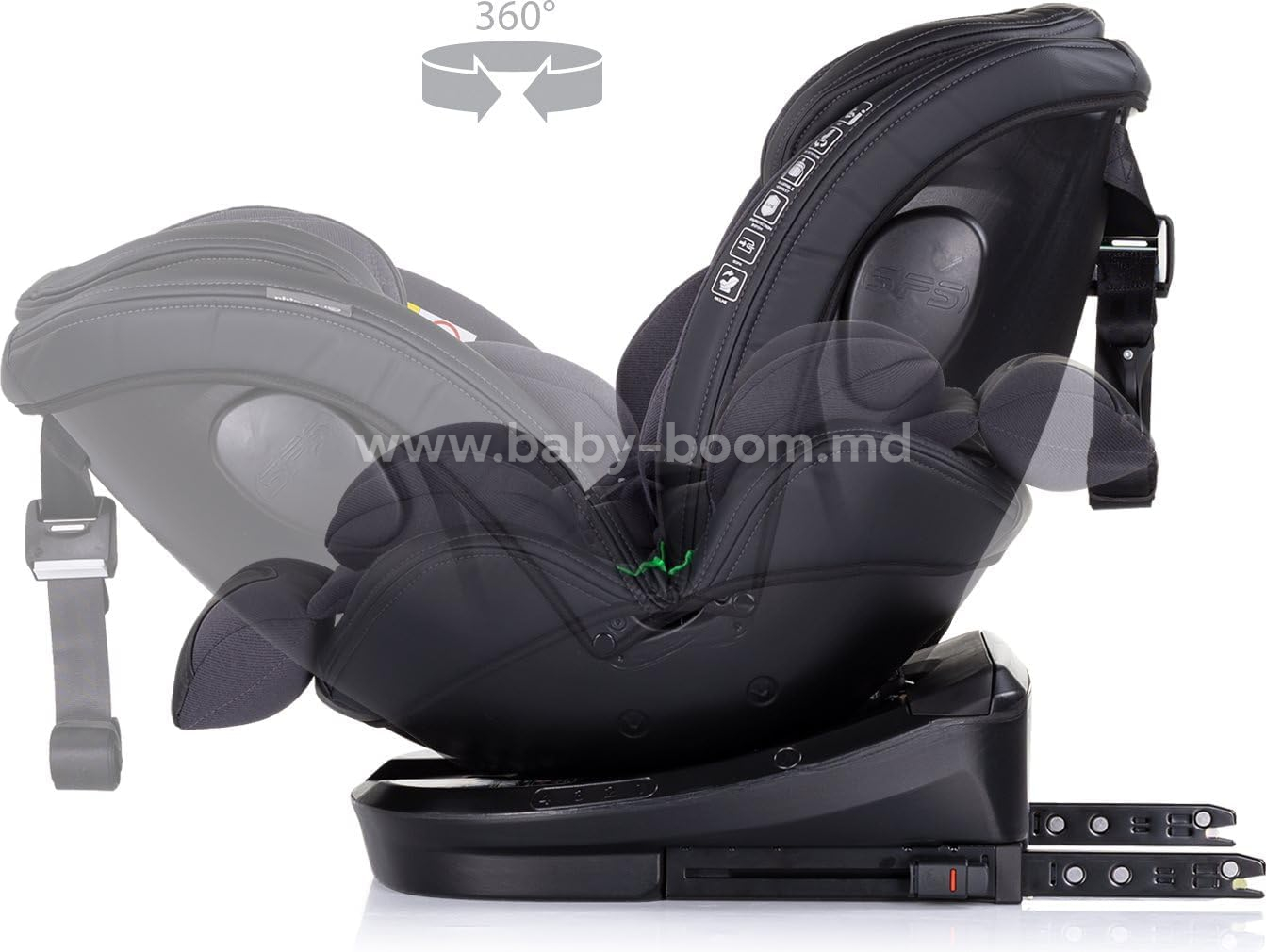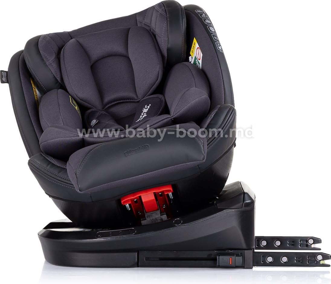 - Scaunul poate fi fixat la vehicul folosind centuri de siguranță standard pentru copii cu înălțimea de 100–150 cm; Scaunul se rotește la 360 de grade pe baza sa din plastic.