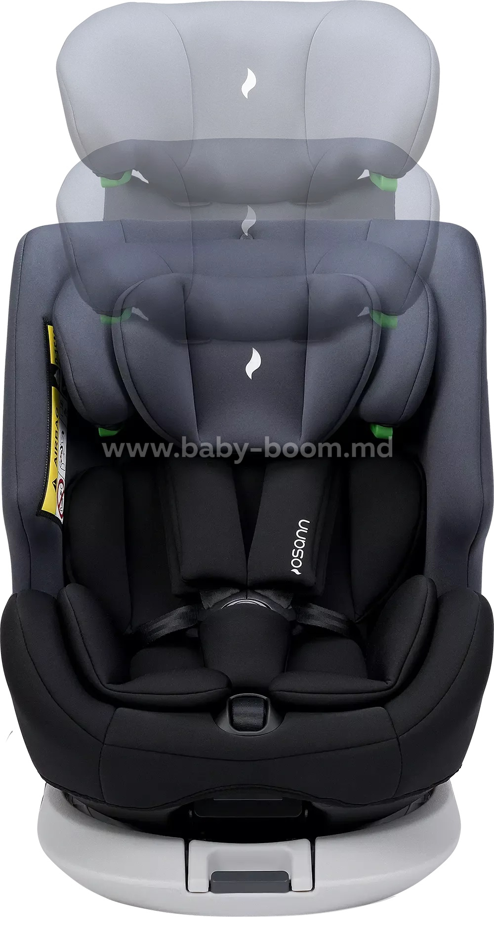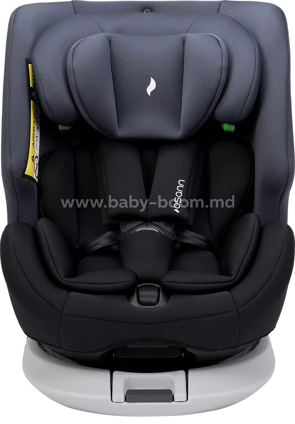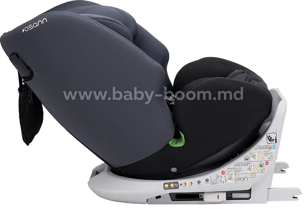 - Scaunul se rotește la 360 de grade, permițându-vă să schimbați ușor și lin între pozițiile orientate spre spate și orientate spre înainte. Când sunteți gata să vă așezați copilul, puteți roti scaunul spre ușă, ceea ce face ca fixarea centurii să fie mult mai ușoară. Apoi, rotiți pur și simplu spătarul scaunului în poziția de condus dorită. Scaunul poate fi rotit în toate pozițiile, cu excepția celei orientate spre înainte (de la 76 la 100 cm).