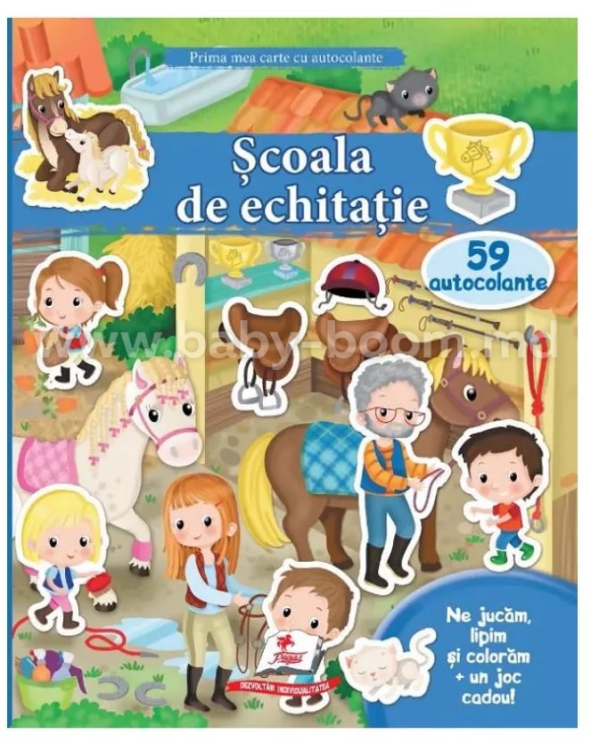 Școala de echitație. 59 autocolante (din seria Prima mea carte cu autocolante) este o carte de activități educativă destinată copiilor cu vârsta cuprinsă între 4 și 5 ani. Aceasta este concepută pentru a stimula creativitatea, motricitatea fină și vocabularul celor mici prin jocuri de lipit, scris și colorat.