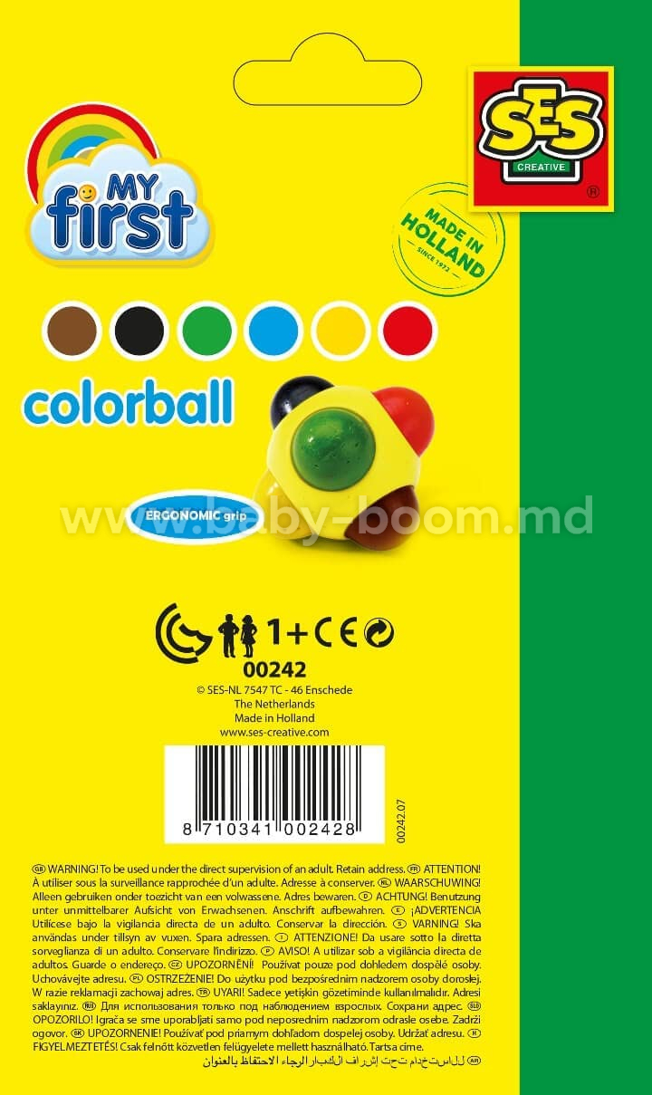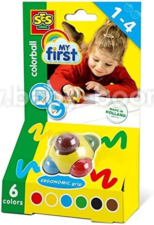 My First este o linie de produse concepută special pentru cele mai tinere minți creative. Produsele acestei linii sunt ergonomice, excepțional de sigure, hipoalergenice și fără gluten. Mingea creionului color SES este un produs unic prin care cei mici pot începe în siguranță să-și dezlănțuie creativitatea. Pe minge sunt 6 capace de cretă colorate. Copiii pot începe să descopere cele mai frumoase culori și abilitățile lor artistice încă de la o vârstă foarte fragedă. Bila de creion colorată este ergonomică și ușor de ținut.