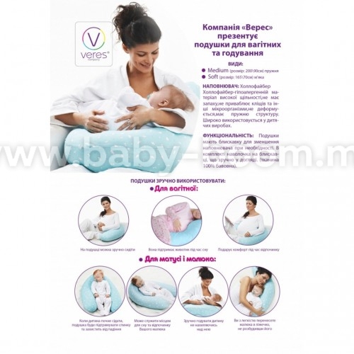 Perna pentru alaptare Veres de o formă specială vă permite să luați cea mai confortabilă și corectă poziție, susține spatele, reduce sarcina pe coloana vertebrală. Datorită acestei perne, puteți ține ușor copilul și aplicați-l corect pe piept. Perna pentru alaptare Veres este fabricată din materiale de calitate. Este umplut cu bile holofiber, care sunt distribuite uniform pe toată perna.