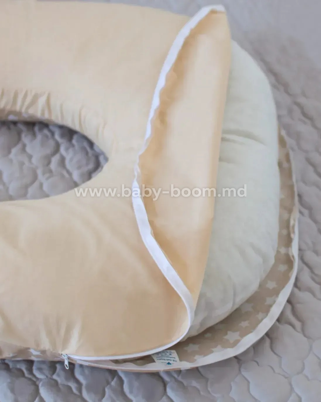 - Confort hipoalergenic: Interiorul este umplut cu o fibră siliconizată moale. Aceasta își păstrează perfect forma, nu reține mirosurile și este complet sigură pentru tine și bebelușul tău.