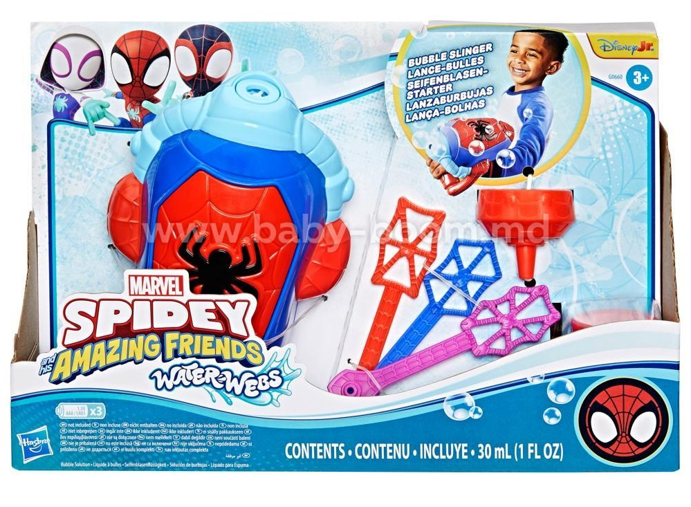 Devino un adevărat erou în gașca ta cu pistolul de făcut baloane de săpun SPIDEY WATER WEBS BUBBLE SLINGER!