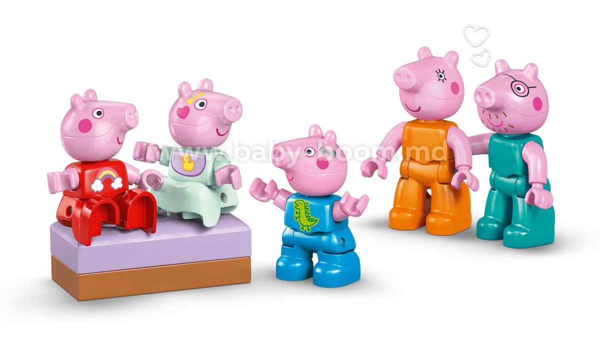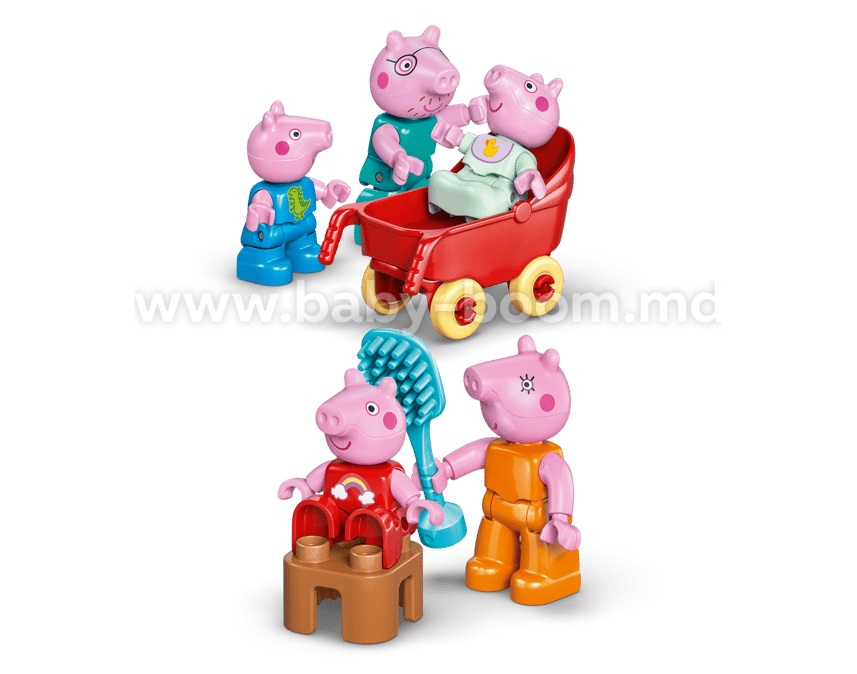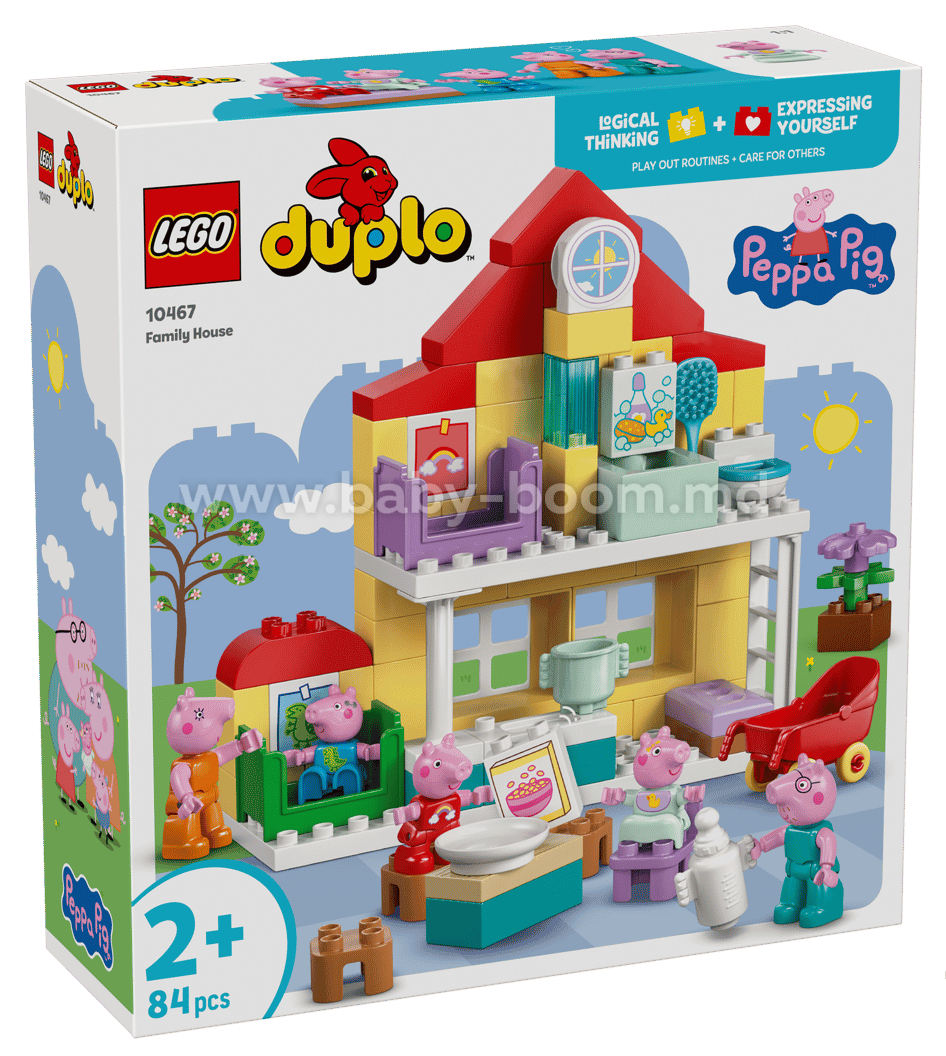 Cei mici redau rutina zilnică alături de personajele lor preferate din serial, cu setul de construcție Casa de familie a Purcelușei Peppa (10467). Acest cadou pentru copiii de 2 ani și mai mari include întreaga familie a Purcelușei Peppa, cei 5 membri, inclusiv Purcelușa Evie. Inspirată din serial, această căsuță LEGO® DUPLO® pe 2 niveluri include camera lui George, camera Purcelușei Peppa, o bucătărie, o baie și un living. Acest set de joacă îi inspiră pe cei mici să recreeze scene din serialși momente din propria lor rutină, precum pregătirea pentru culcare sau micul dejun în familie. Cu cele 5 figurine LEGO DUPLO din acest set: Mămica Purcelușă, Tăticul Purceluș, George, Evie și Purcelușa Peppa, cei mici își pot dezvolta inteligența emoțională imaginându-și cum e să apară un nou membru în familie. Plin de accesorii pentru joaca fantezistă, acest set îi inspiră pe copilași să își imagineze că au grijă de bebelușă: o scot la plimbare în cărucior, îi dau biberonul sau îi fac băiță.Setul conține 84 de piese.