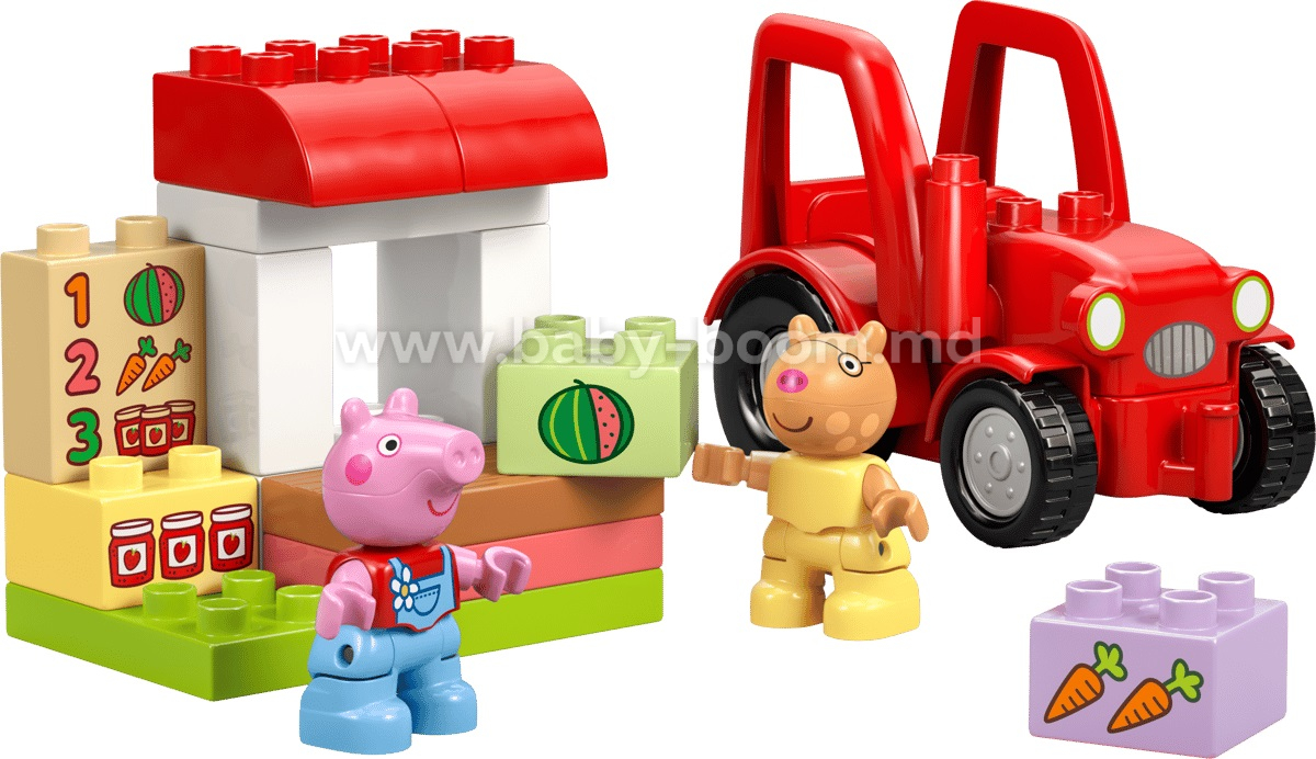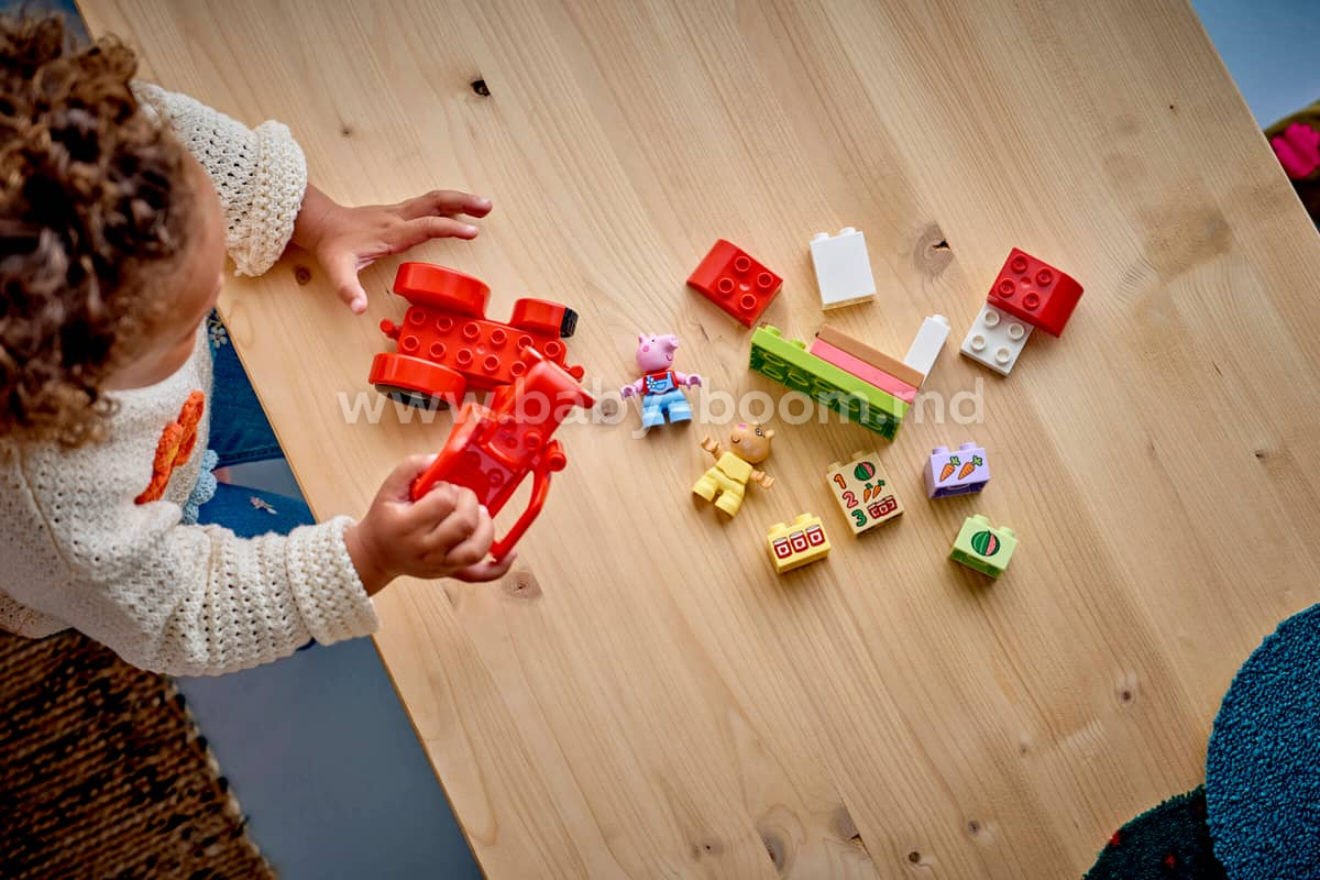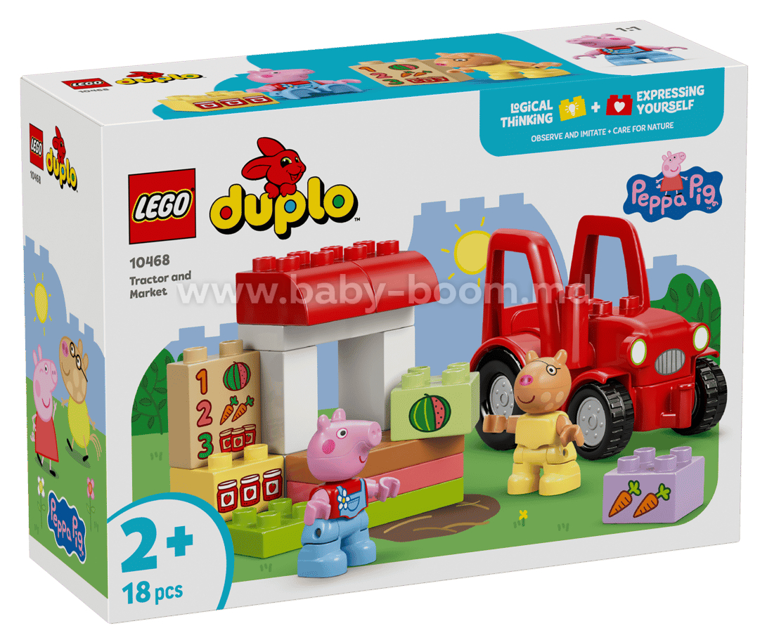 Ajută-i pe cei mici să-și dezvolte creativitatea cu jucăria de construcție Purcelușa Peppa Tractor și piață (10468). Micii constructori de 2 ani și mai mari se bucură de jocuri pline de imaginație, imitând activitatea dintr-un magazin agricol, în care aranjează pe rafturi cărămizile LEGO® DUPLO® decorate cu alimente de vândut. Acest set de joacă pe roluri include figurinele Pedro Poneiul și Purcelușa Peppa, un tractor roșu funcțional și cărămizi cu morcov, pepene și borcan de gem. Acest set oferă copilașilor o mulțime de oportunități de învățare și dezvoltare. Observând și imitând scene din serial, cei mici își pot dezvolta abilități cognitive precum rezolvarea de probleme și memoria. Micii constructori își folosesc abilitățile motorii fine pentru a asambla tractorul și a construi taraba. Setul include un meniu decorat cu pepene, morcovi și borcane de gem. Cei mici pot exersa recunoașterea numerelor și asocierea lor pentru a găsi cărămizile decorate corespunzătoare. Setul conține 18 piese.