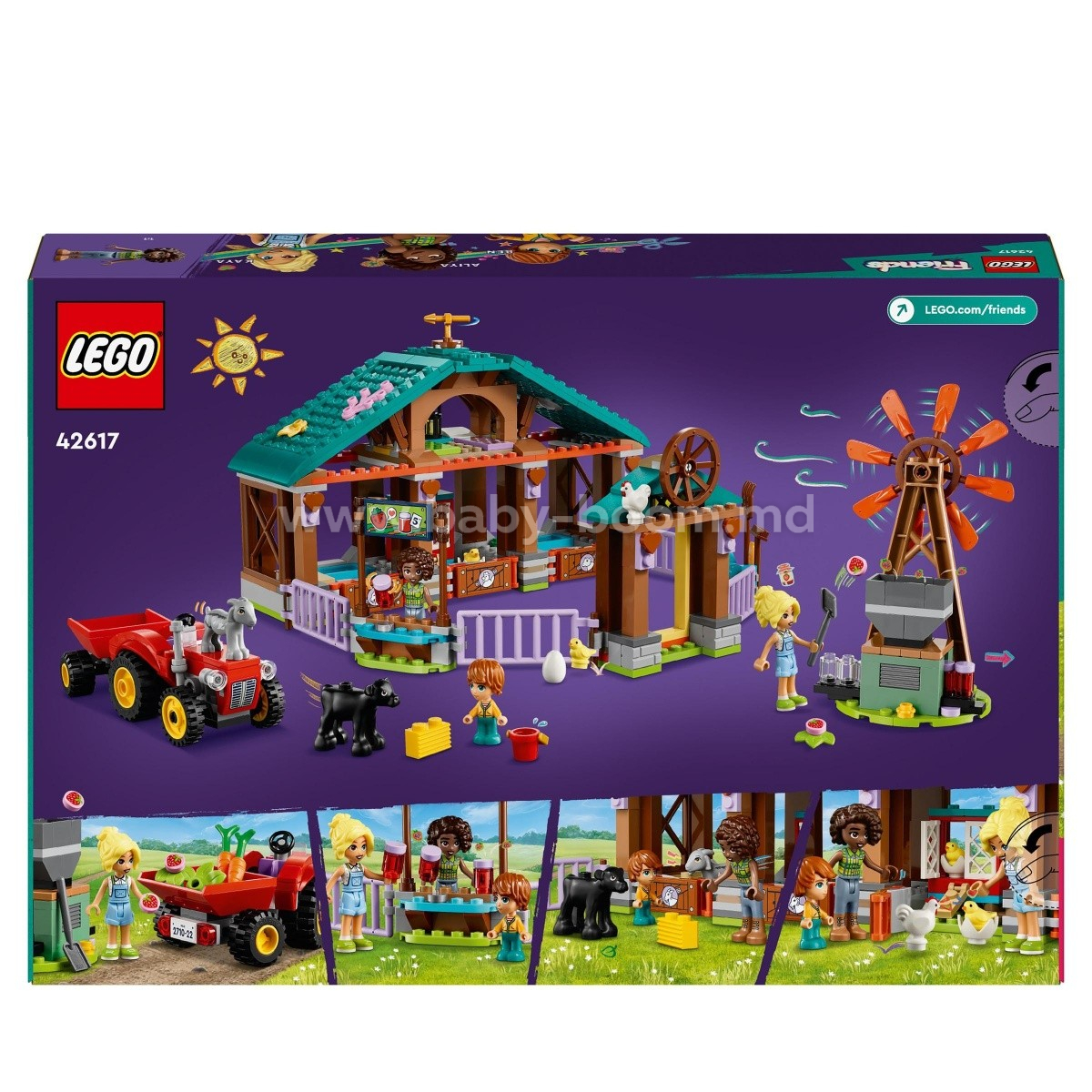 Joaca creativă este super distractivă cu setul LEGO® Friends Refugiu pentru animale de fermă (42617) pentru fete, băieți și copii de 6+ ani. Copiii pot crea propriile lor povești în timp ce culeg legumele, fac gem de căpșuni și au grijă de animale. Setul vine cu 3 figurine pentru a stimula o joacă în jurul prieteniei, plus o capră, o vacă, o găină și doi puișori. Clădirea animalelor se deschide pentru a dezvălui zone separate pentru figurinele de animale.
