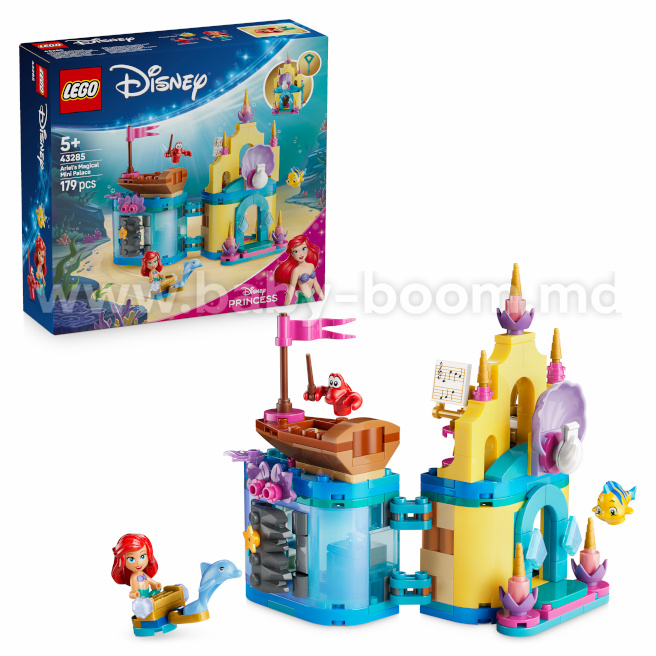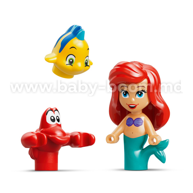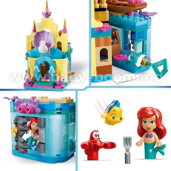 Acest set LEGO pentru fete și băieți include 3 personaje LEGO ǀ Disney: Ariel, Flounder și Sebastian, un mini-palat și o grotă care poate fi închisă și încuiată, o barcă mică și multe altele. Micuțul castel portabil este creat pentru distracție în călătorii.