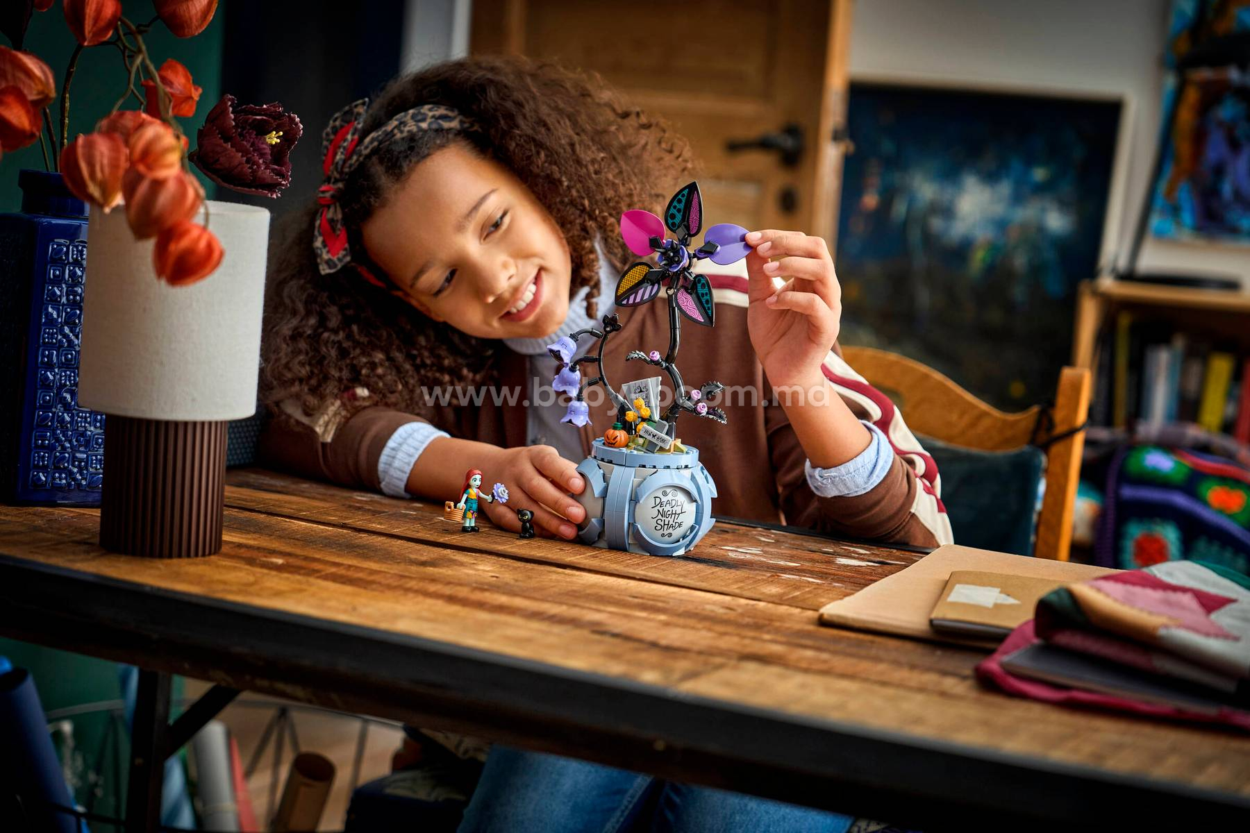 - SET DE CONSTRUCȚIE CU FLORI – Oferă copiilor, fetelor și băieților cu vârsta începând de la 9 ani opțiuni distractive de joacă sau etalare și cultivă pasiunea pentru designul fantezist cu acest set de construcție de jucărie inspirat din filmul Coșmar înainte de Crăciun creat de Tim Burton.