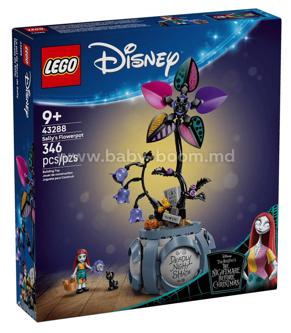 Surprizele îi așteaptă pe copiii cu vârsta de 9 ani și mai mult în această jucărie de construcție LEGO® ǀ Disney Ghiveciul lui Sally (43288). Acest set de construcție cu flori, inspirat de filmul Coșmar înainte de Crăciun creat de Tim Burton, stârnește joaca cu 2 personaje LEGO ǀ Disney: Sally și o pisicuță neagră. Include un ghiveci de flori cu 2 flori din cărămizi, camere ascunse și autocolante cu elemente grafice în interior și la exterior. Spațiul din interior include, de asemenea, un coș, un cazan, o masă construibilă și multe altele. Personajele încap în interior pentru a fi depozitate după încheierea jocului. Această jucărie de construcție pentru fete sau băieți cu vârsta de la 9 ani în sus este o idee grozavă de cadou cu flori pentru o zi de naștere sau o sărbătoare. Etalează acest ghiveci de flori alături de alte jucării de construcție LEGO ǀ Disney (vândute separat) pentru a crea o colecție. Cultivă dragostea unui copil pentru joaca plină de imaginație cu o construcție careoferă, de asemenea, opțiuni distractive de joacă. Copiii pot construi cu încredere folosind aplicația LEGO Builder, apropiind, rotind în 3D și urmărindu-și progresul cu instrucțiuni digitale ușor de urmat. Setul conține 346 de piese.