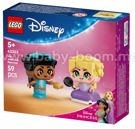 Oferă-le copiilor de peste 5 ani setul LEGO® ǀ Disney Princess Mini Jasmine & Rapunzel (43303). Personajele din filmul „Jasmine și Rapunzel” sunt create pentru a inspira povestiri și jocuri de rol cu ajutorul accesoriilor incluse în set – lampa magică și tigaia.