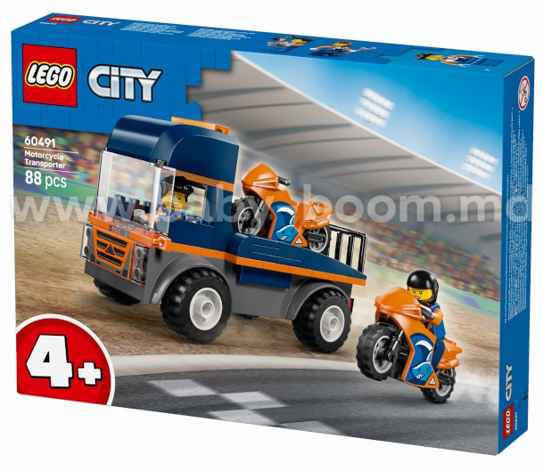 Inițiați copiii cu vârsta de peste 4 ani în lumea jocurilor creative cu setul LEGO® City Transportor pentru motociclete (60491). Acest set include un camion cu platformă și anvelope masive din cauciuc, 2 motociclete sportive și 2 minifigurine de piloți cu căști. Copiii pot încărca și descărca motocicletele folosind rampa, pot juca curse epice de motociclete și pot așeza minifigurina în cabină pentru aventuri distractive pe șosea.