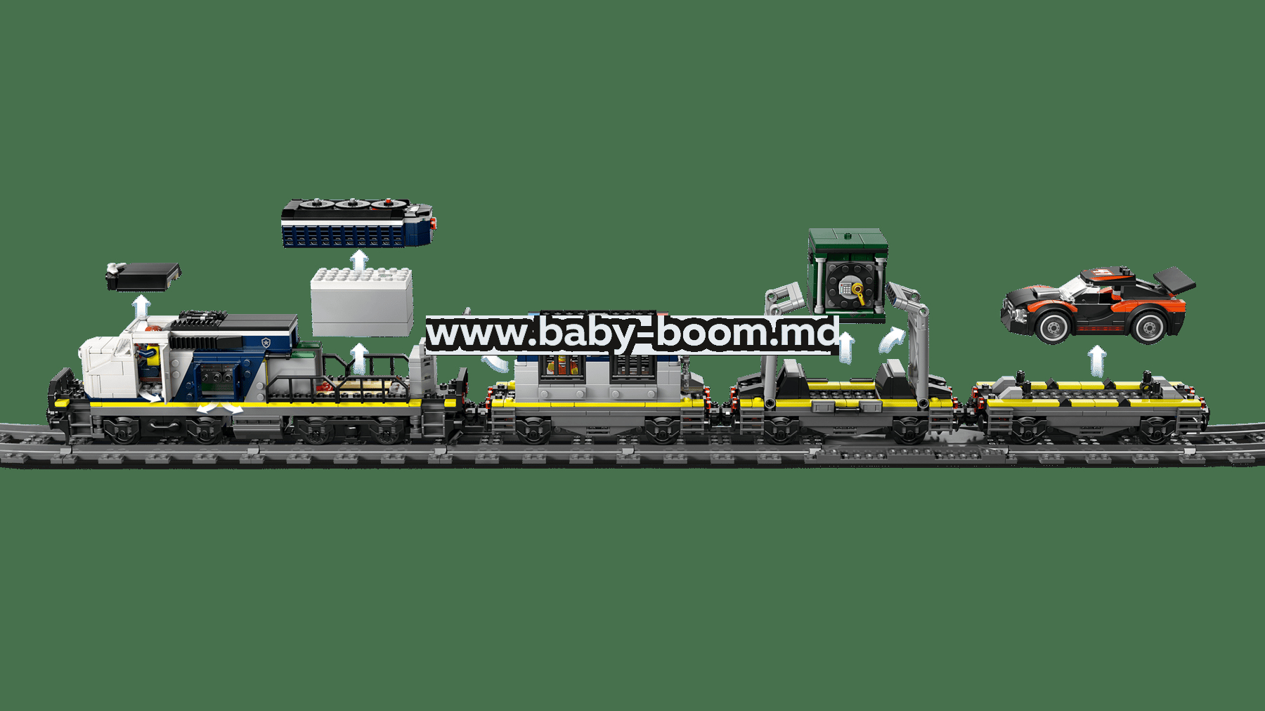 - DIMENSIUNI – Locomotiva de jucărie împreună cu cele 3 vagoane platformă din acest set LEGO® City de 1.313 piese măsoară peste 9 cm în înălțime, 80 cm în lungime și 6 cm în lățime