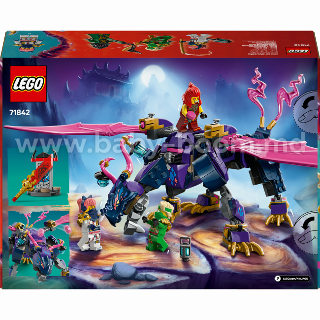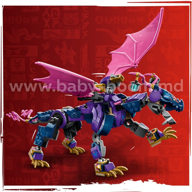 Acest set de construcție pentru copii prezintă un dragon de jucărie cu coadă, membre, aripi, cap și maxilar articulate, 2 poziții pentru o minifigurină pe spate și un lansator de piroane sub fiecare aripă.