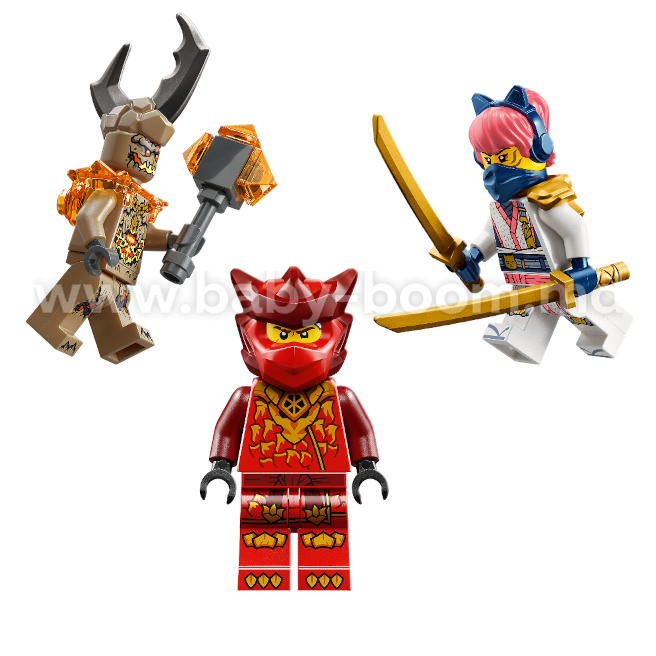 Această jucărie ninja ieftină vine, de asemenea, cu 3 minifigurine: Kai cu 2 săbii, Sora cu 2 săbii și un monstru terestru cu labe cu gheare, care le va permite copiilor să se bucure de ore întregi de aventuri, jucând scene din sezonul 4 al serialului „NINJAGO: Răscoala dragonilor”.