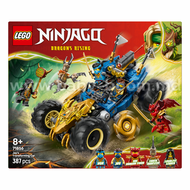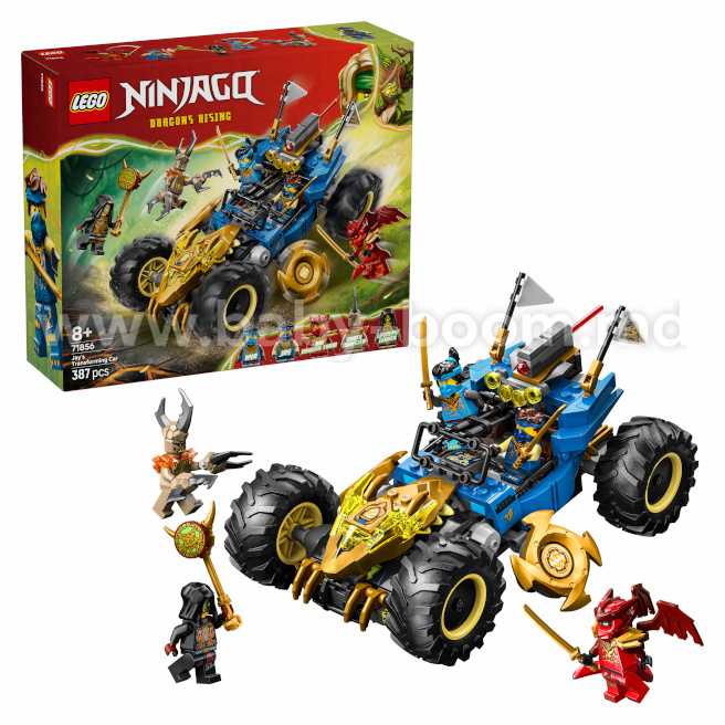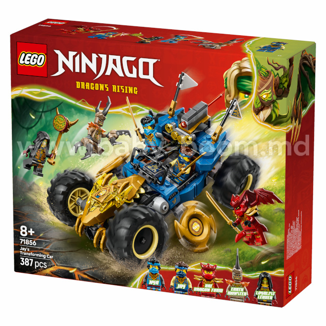 Băieții și fetele cu vârsta de peste 8 ani se pot bucura de ore întregi de joc dinamic cu setul LEGO® NINJAGO® „Mașina transformabilă a lui Jay” (71856). Această jucărie 2 în 1 sub forma unei mașini de curse ninja poate fi folosită pentru joacă și expunere în două variante: în modul normal sau în modul dragon, pentru care trebuie să răsturnați partea din față, deschizând ghearele aurii, capul dragonului și shurikenele rotative.