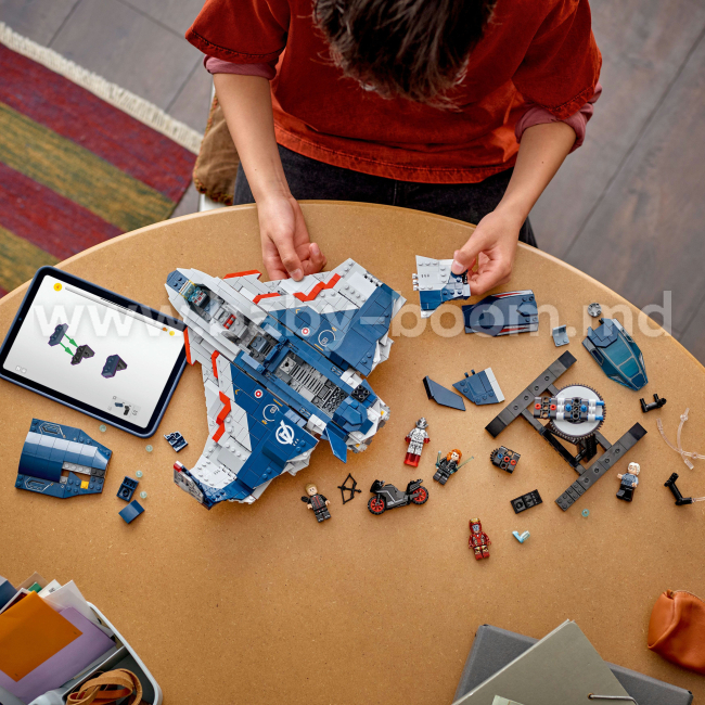 Modelul Quinjet construibil este însoțit de 5 minifigurine: Văduva Neagră cu motocicleta ei; Iron Man; Quicksilver; Ultimate Ultron; și Hawkeye cu arcul și săgețile sale. Minifigurinele pot fi atașate în mai multe locuri pe aeronavă. Quinjet-ul are un cockpit care se deschide, 2 lansatoare frontale de piroane și spațiu de depozitare pentru armele Văduvei Negre și arcul lui Hawkeye. Ușa din spate se deschide astfel încât copiii să poată duce motocicleta înăuntru și afară. Un suport rotativ și detașabil este inclus pentru a oferi o etalare la 360 de grade a aeronavei emblematice. Pentru mai multă distracție digitală, constructorii pot apropia și roti modelele în 3D și își pot urmări progresul folosind aplicația distractivă și intuitivă LEGO Builder. Setul conține 1.131 de piese.