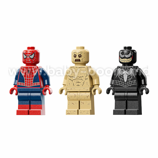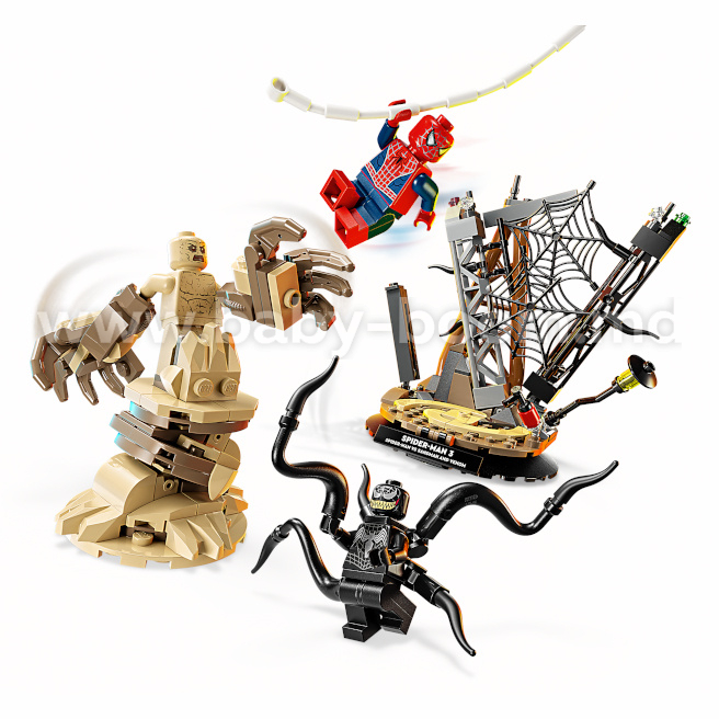 Setul de asamblare include distribuția de vedete din film și o mulțime de elemente interactive: Spider-Man coboară din turn pe pânză; Sandman se ridică din dărâmături cu mâna sa uriașă; iar Venom lovește cu cele 4 tentacule mobile. Copiii pot expune modelul LEGO ca decor pentru cameră cu ajutorul unui suport robust și al unei plăcuțe cu numele sau pot detașa minifigurinele pentru a inventa propriile povești pentru jocurile de rol.