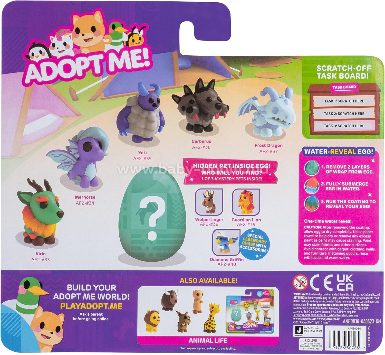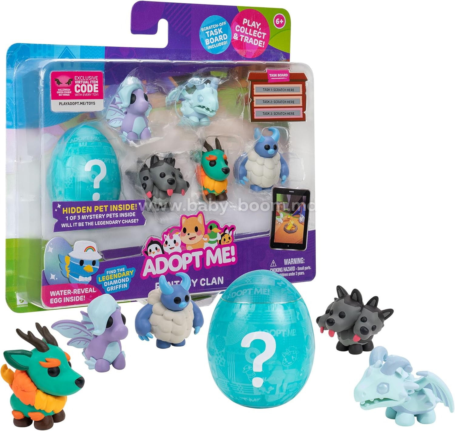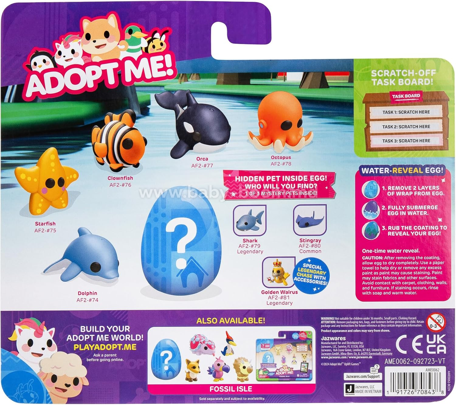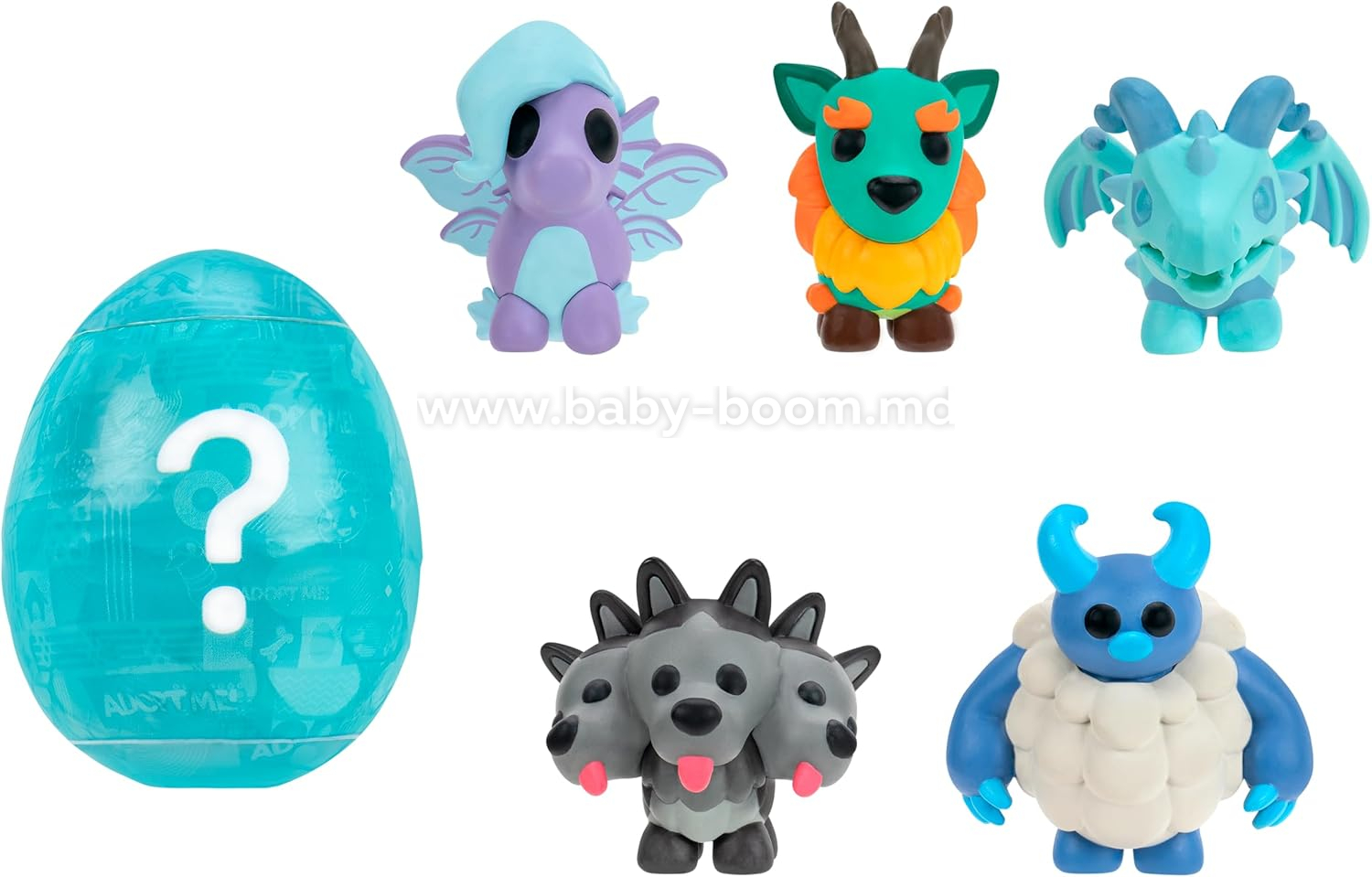Pentru a găsi un animal de companie misterios, desface oul și scufundă-l în apă pentru a dezvălui unul dintre cele trei modele de ouă din joc. În interiorul oului tematic, vei găsi unul dintre cele trei animale de companie misterioase din plastic, de 5 centimetri, de raritate variabilă. Ca bonus, fiecare set include un cod virtual exclusiv. Aceste obiecte de colecție sunt perfecte atât pentru joacă, cât și pentru expunere. Colecționează toate seturile Adoptă-mă.