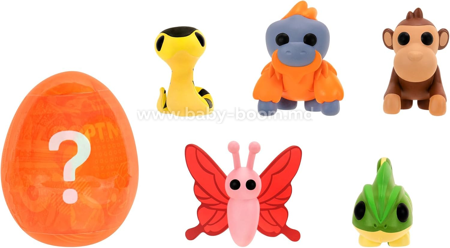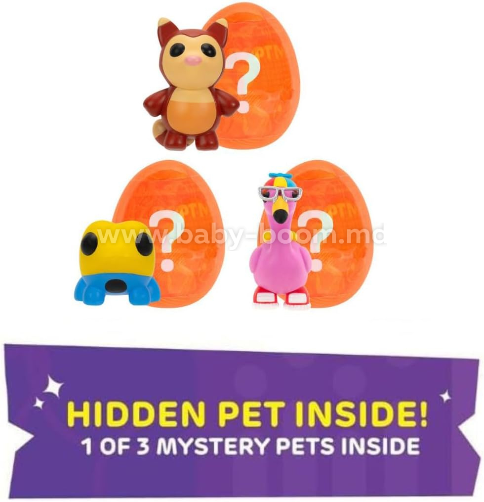 Pentru a găsi un animal de companie misterios, desface oul și scufundă-l în apă pentru a dezvălui unul dintre cele trei modele de ouă din joc. În interiorul oului tematic, vei găsi unul dintre cele trei animale de companie misterioase din plastic, de 5 centimetri, de raritate variabilă. Ca bonus, fiecare set include un cod virtual exclusiv. Aceste obiecte de colecție sunt perfecte atât pentru joacă, cât și pentru expunere. Colecționează toate seturile Adoptă-mă.
