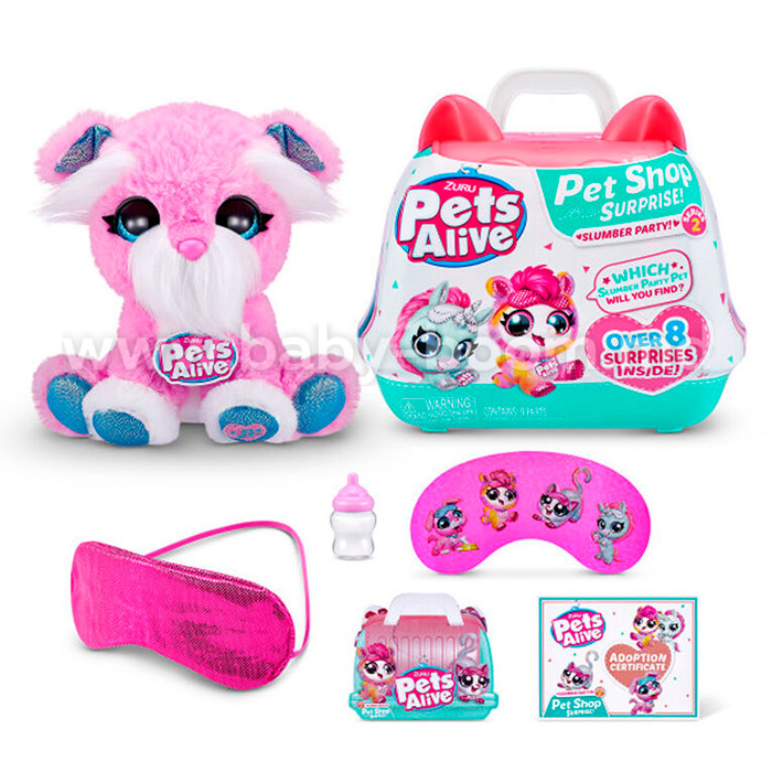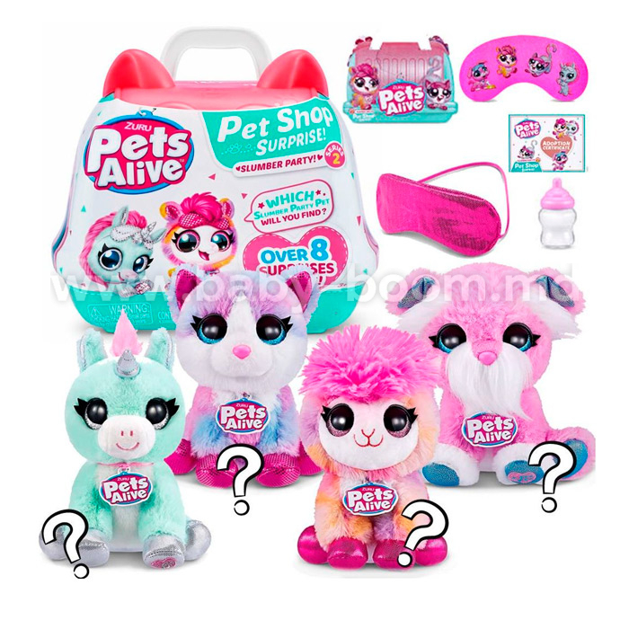Setul contine accesorii pentru o petrecere in pijamale: o masca de somn si o sticluta. De asemenea, exista accesorii pentru detinatorul animalutului - un certificat de adoptie, autocolante viu colorate cu personaje.